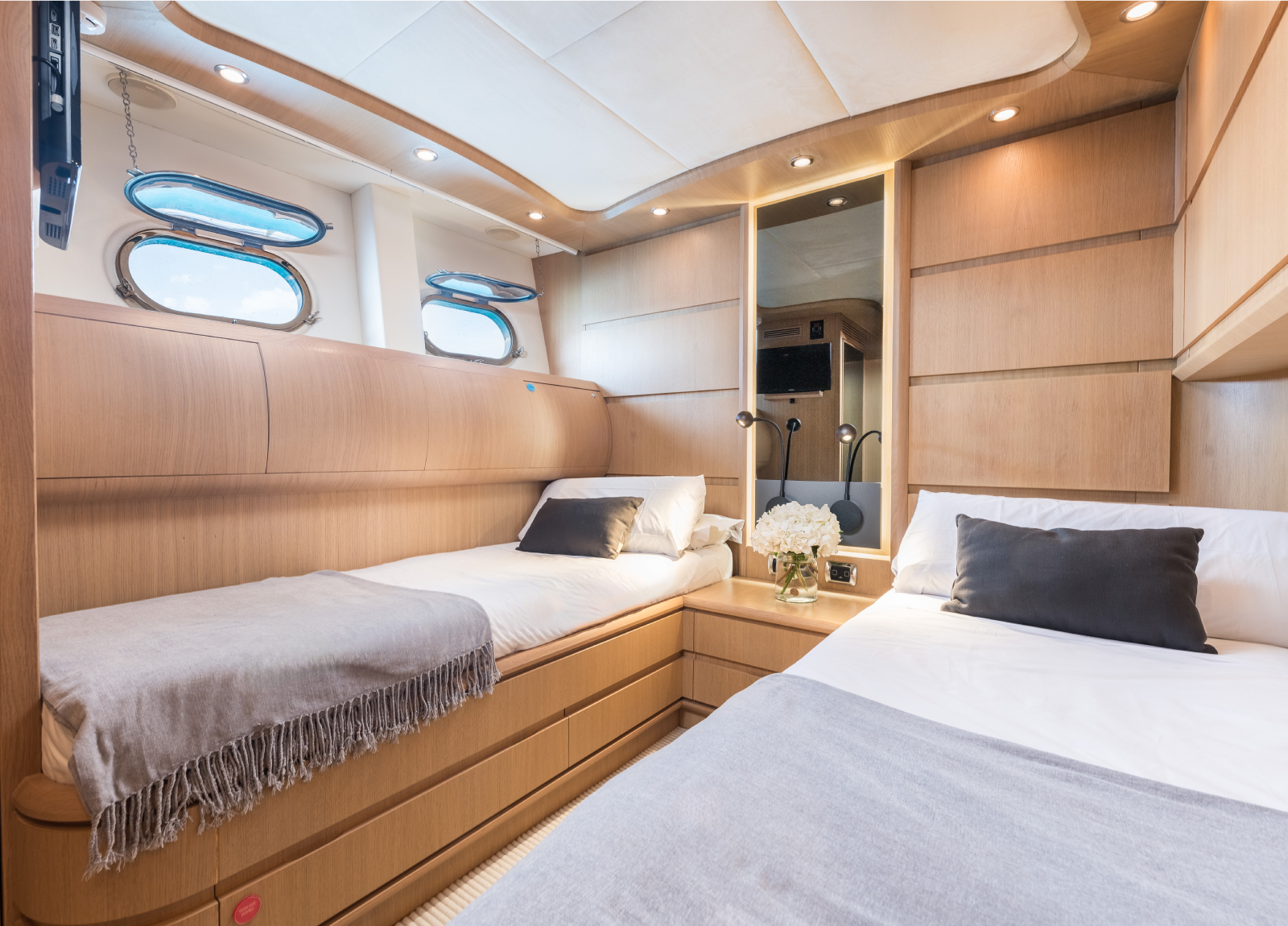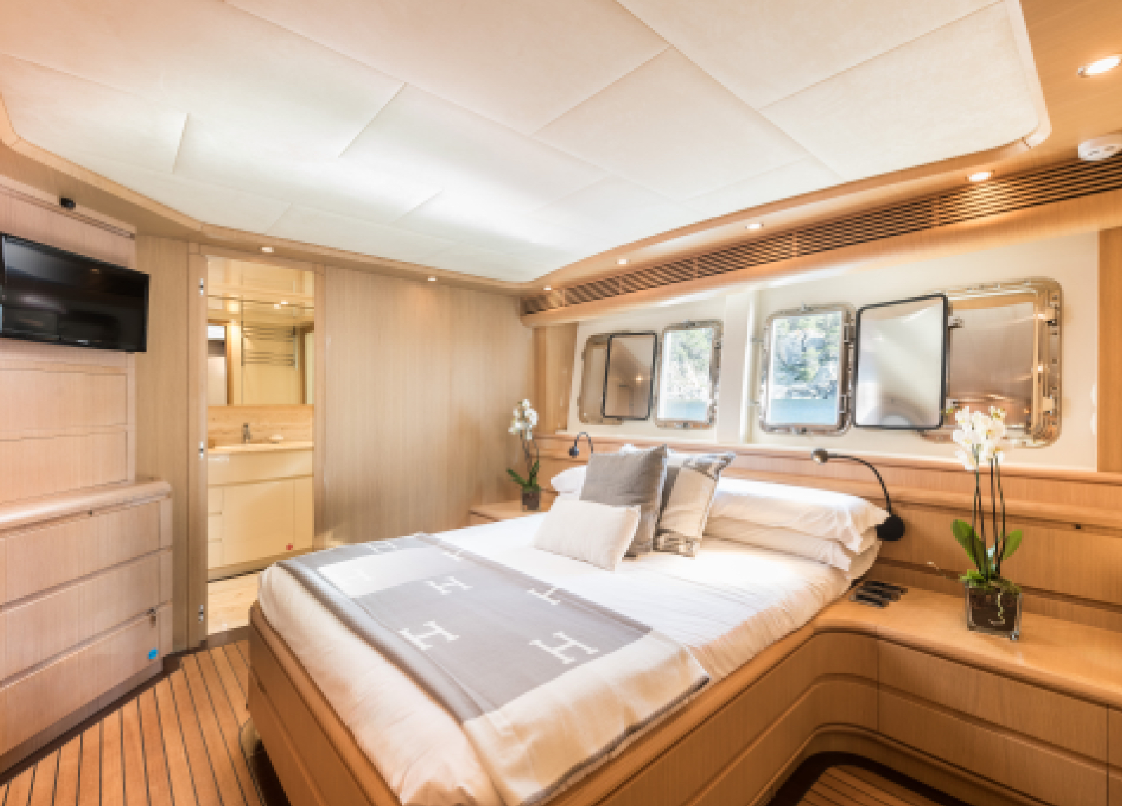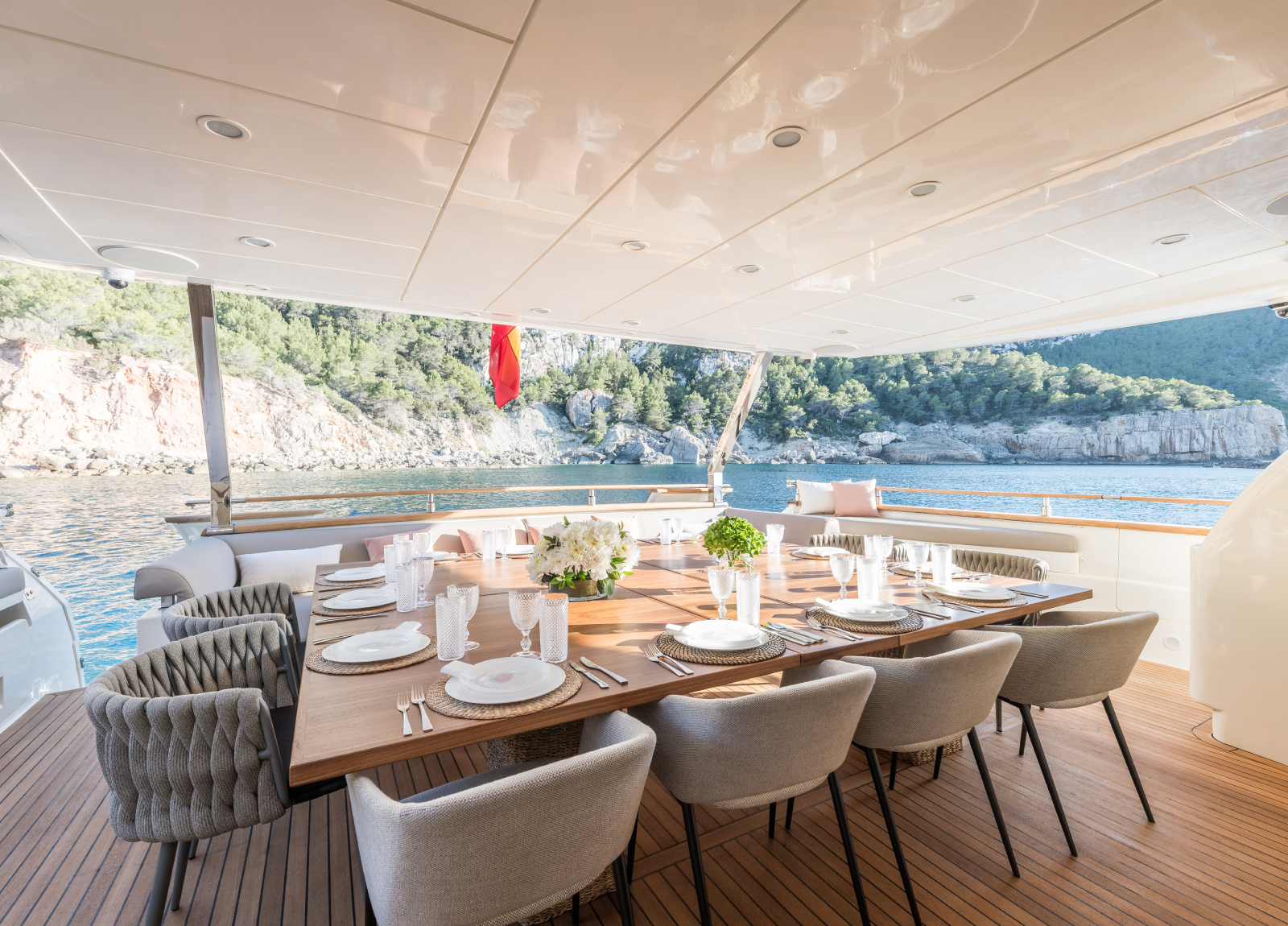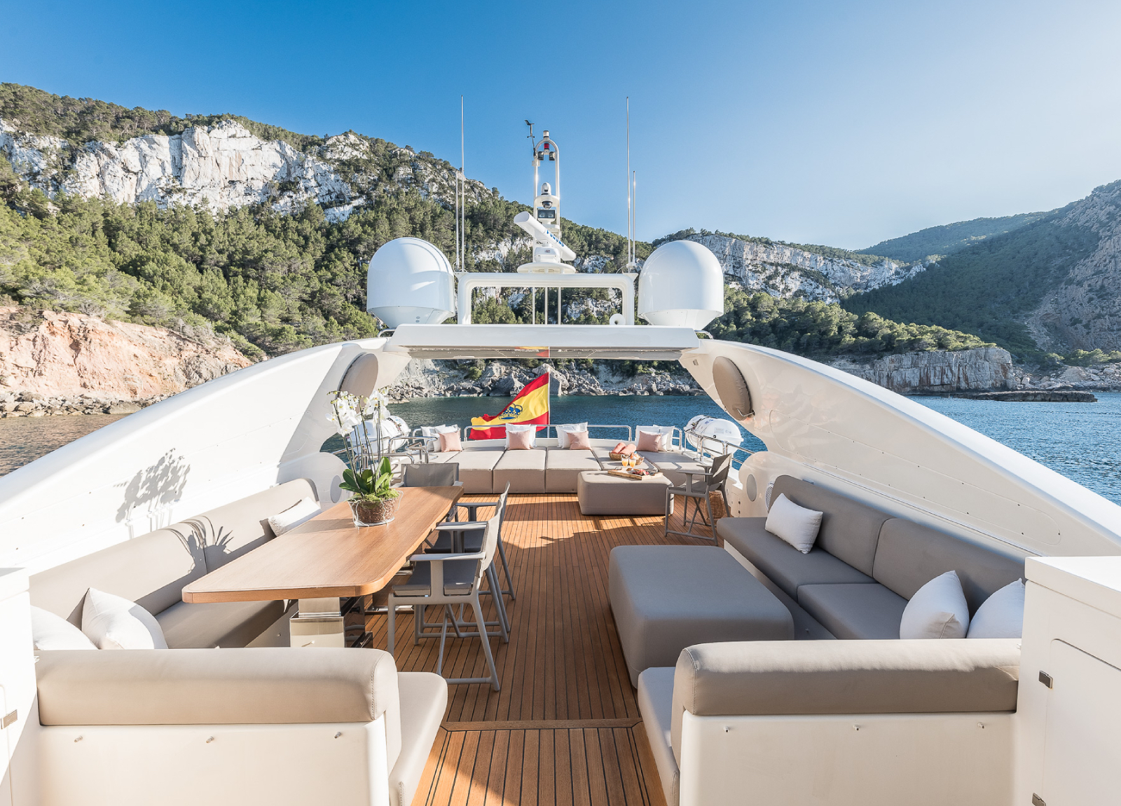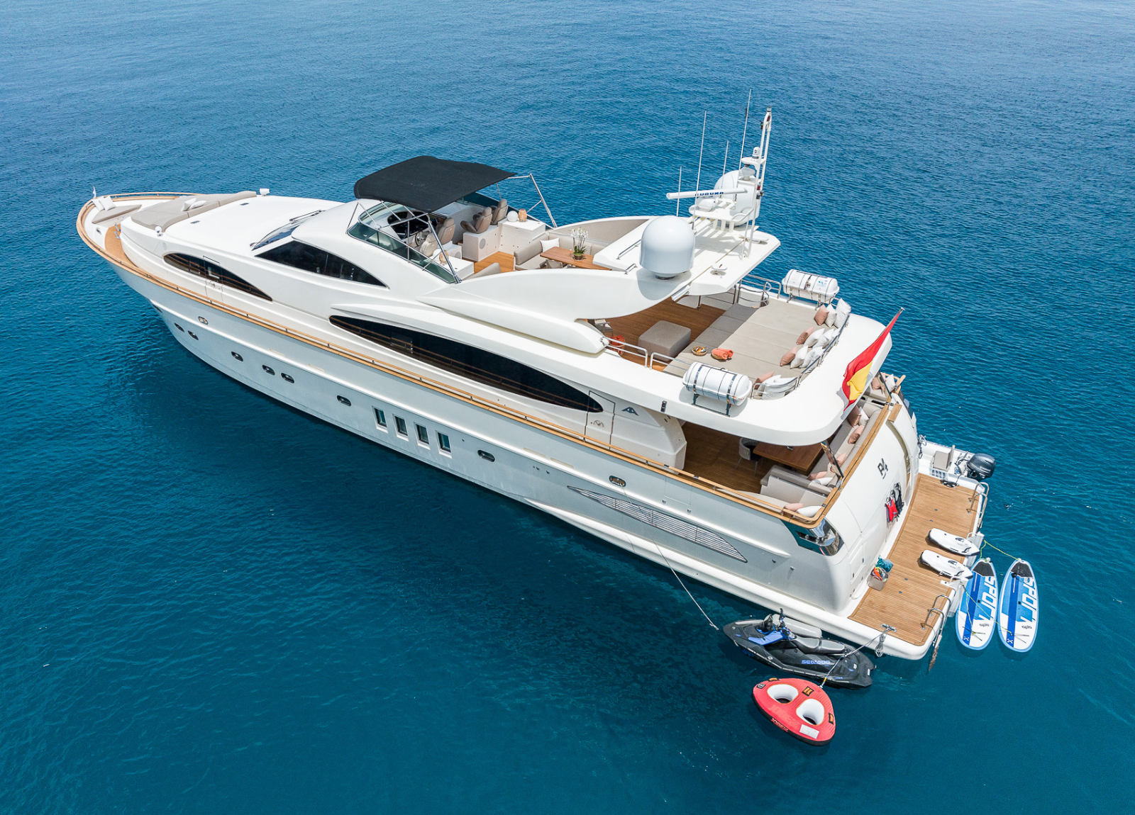 B4 ist eine 31,5 Meter Luxusyacht, die 2005 von der renommierten spanischen Werft Astondoa auf den Markt gebracht wurde und über ein einzigartiges Rumpfdesign verfügt, das die Stabilität auf See erhöht. Im Jahr 2024 wurde die Astondoa 102 GLX einer umfassenden ästhetischen Überholung im Wert von mehr als einer Million Euro unterzogen. B4 liegt auf Ibiza und bietet ganzjähriges Chartern auf den wunderschönen Balearen, die für ihre goldenen Strände, kristallklares Wasser, ein pulsierendes Nachtleben und die köstliche spanische Küche bekannt sind. Diese Yacht bietet bequem Platz für bis zu 12 Gäste in 6 Kabinen mit eigenem Bad, darunter eine geräumige Masterkabine, 2 VIP-Kabinen, 2 umbaubare Zweibettkabinen und eine neue Doppelkabine auf dem Hauptdeck. Der Innenraum ist elegant mit hellem Eichenholz und warmen Farbtönen eingerichtet. Das Hauptdeck verfügt über einen großzügigen Salon und einen formellen Essbereich, während die Außenbereiche Ess- und Unterhaltungsmöglichkeiten im Freien bieten, einschließlich eines großen Achterdecks eines Vordecks und einer sonnenverwöhnten Flybridge mit einem Bimini-Top für Schatten. Zusätzlich zur Standard-Wassersportausrüstung bietet die B4 einen 2022 Spark Trixx Jet-Ski für zusätzlichen Spaß.