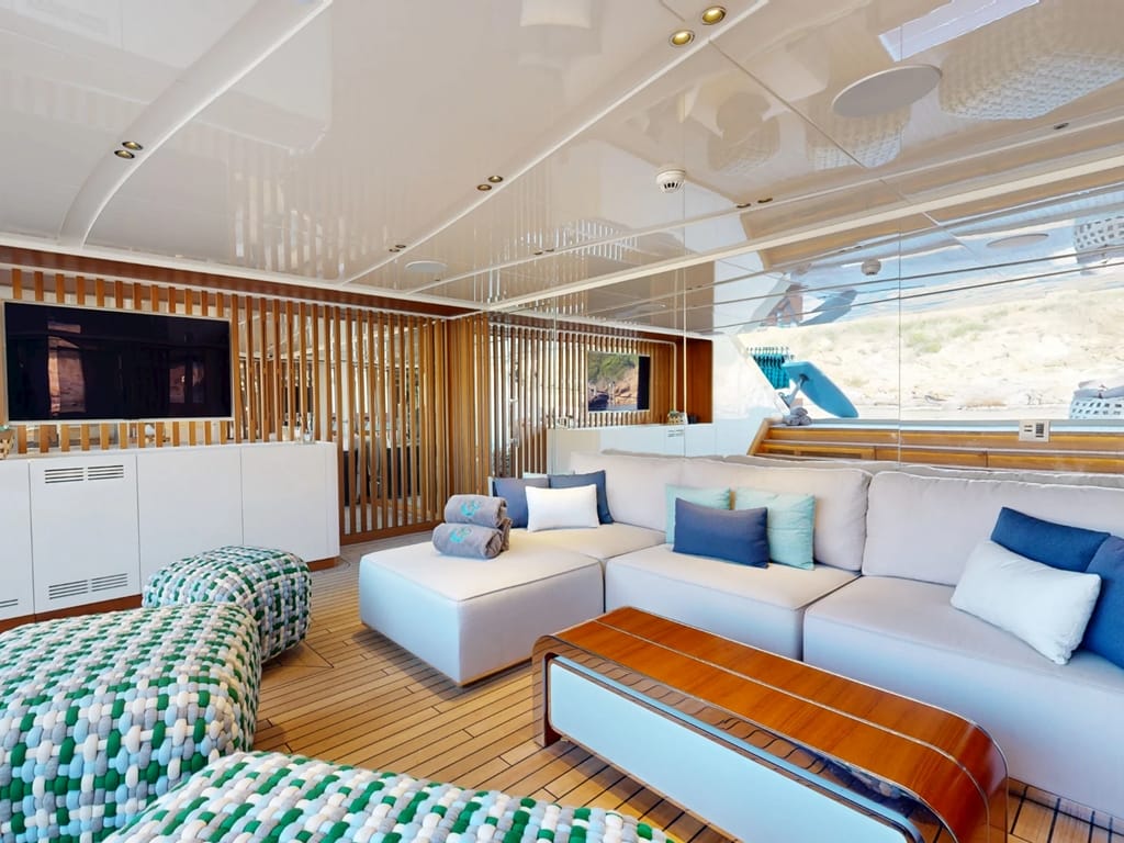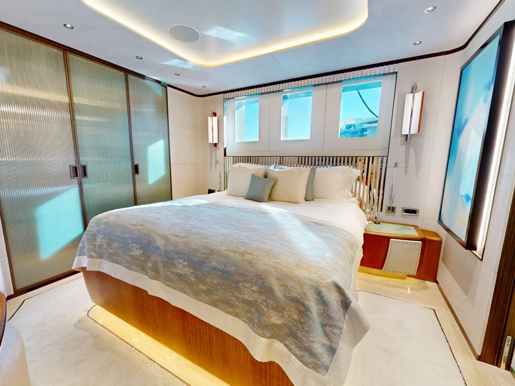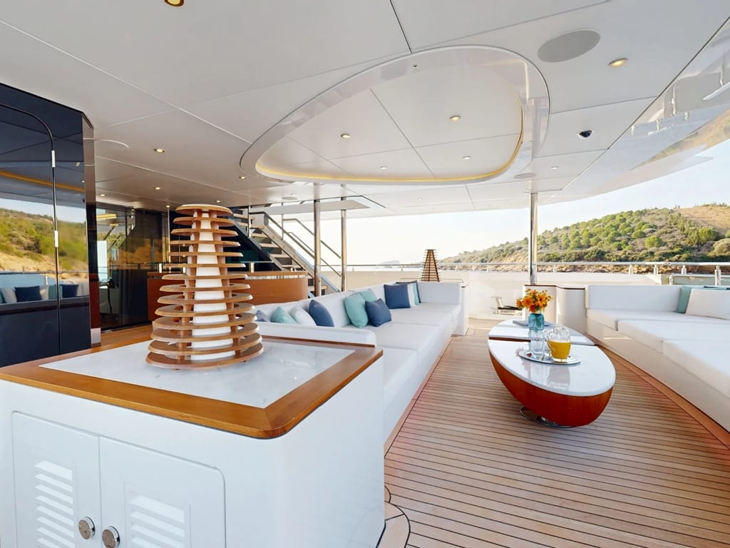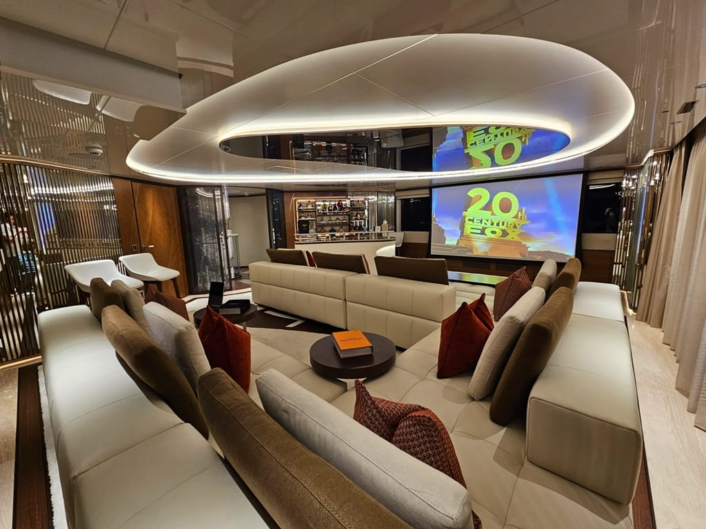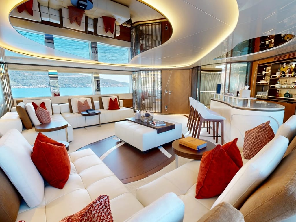 An Bord finden bis zu 12 Gäste in 6 luxuriösen Kabinen Platz, betreut von einer erfahrenen Crew von rund 9 Personen. Zu den Highlights zählen ein großzügiger Beach Club mit Wellnessbereich, ein Jacuzzi auf dem Sonnendeck sowie vielseitige Lounge- und Entertainment-Bereiche, darunter ein flexibel nutzbares Sky-Lounge-Kino. Neben einem Chaseboat, einem Jet Tender und umfangreicher Wassersportausrüstung bleiben hier keine Wünsche offen.