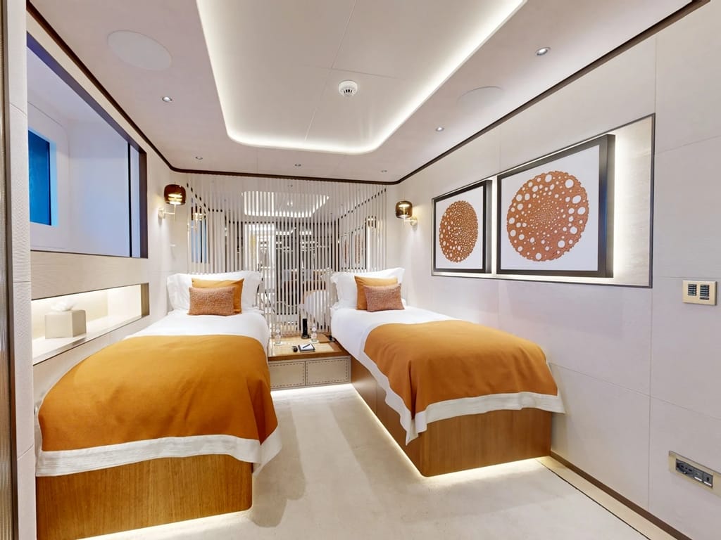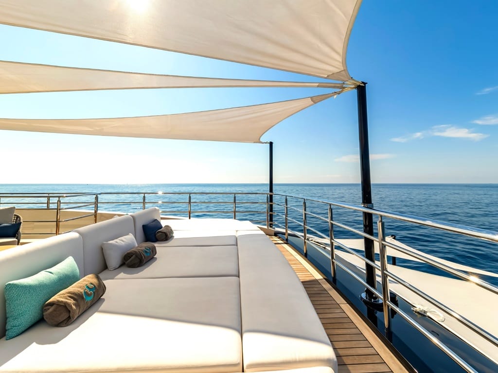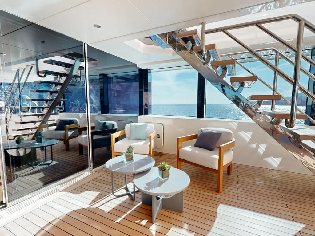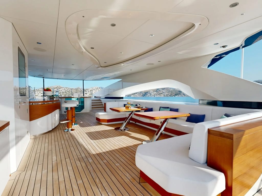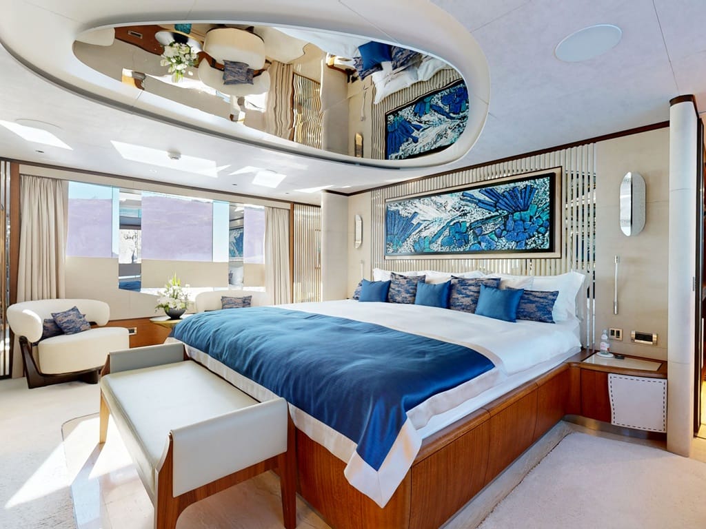 An Bord finden bis zu 12 Gäste in 6 luxuriösen Kabinen Platz, betreut von einer erfahrenen Crew von rund 9 Personen. Zu den Highlights zählen ein großzügiger Beach Club mit Wellnessbereich, ein Jacuzzi auf dem Sonnendeck sowie vielseitige Lounge- und Entertainment-Bereiche, darunter ein flexibel nutzbares Sky-Lounge-Kino. Neben einem Chaseboat, einem Jet Tender und umfangreicher Wassersportausrüstung bleiben hier keine Wünsche offen.