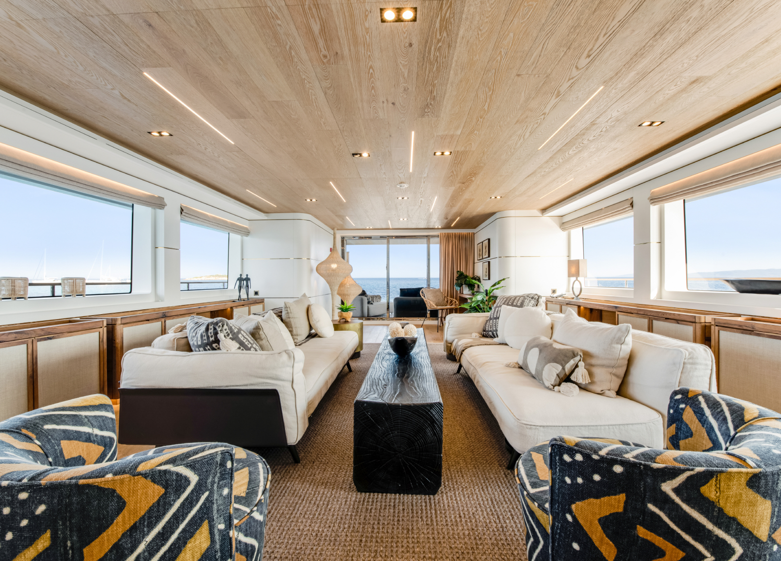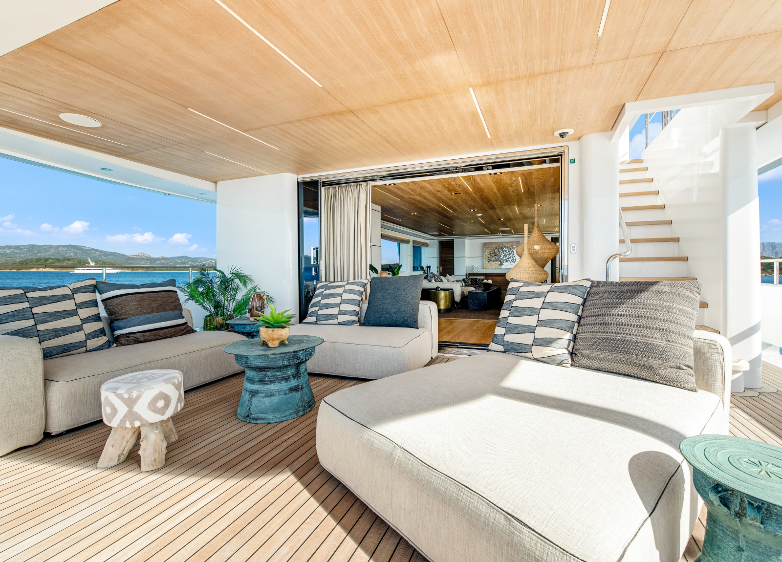 Der Hauptsalon ist perfekt zum Entspannen geeignet und grenzt an das geräumige Sonnendeck mit einem Clubbereich, ideal zum geniessen von Canapes und Cocktails im Freien. Der obere Salon verfügt über einen zentralen Essbereich mit einem beeindruckenden Tisch.