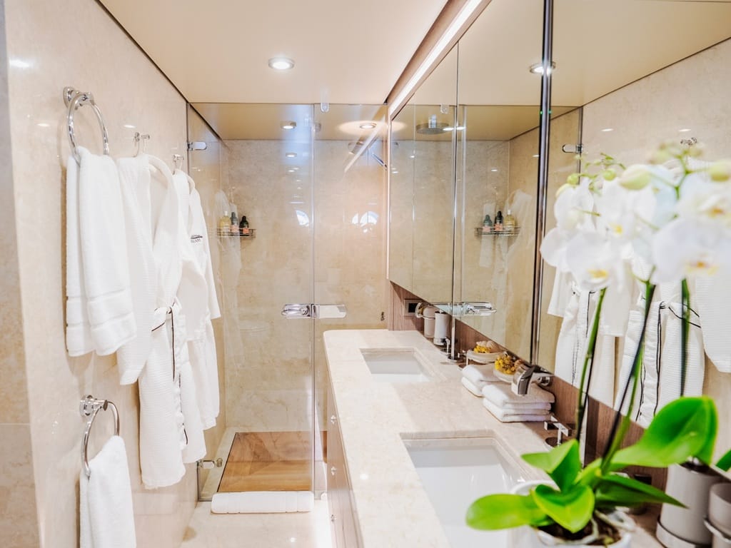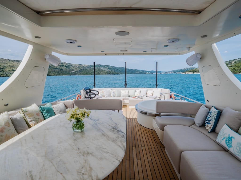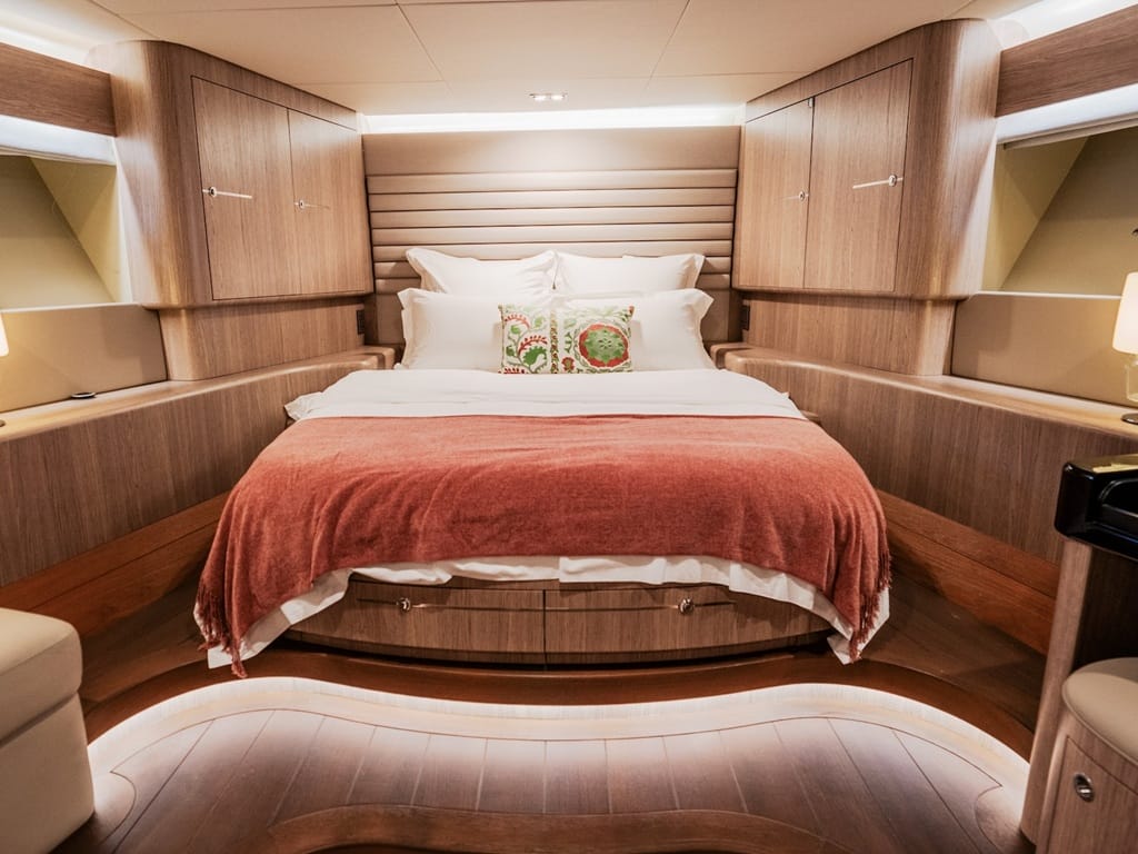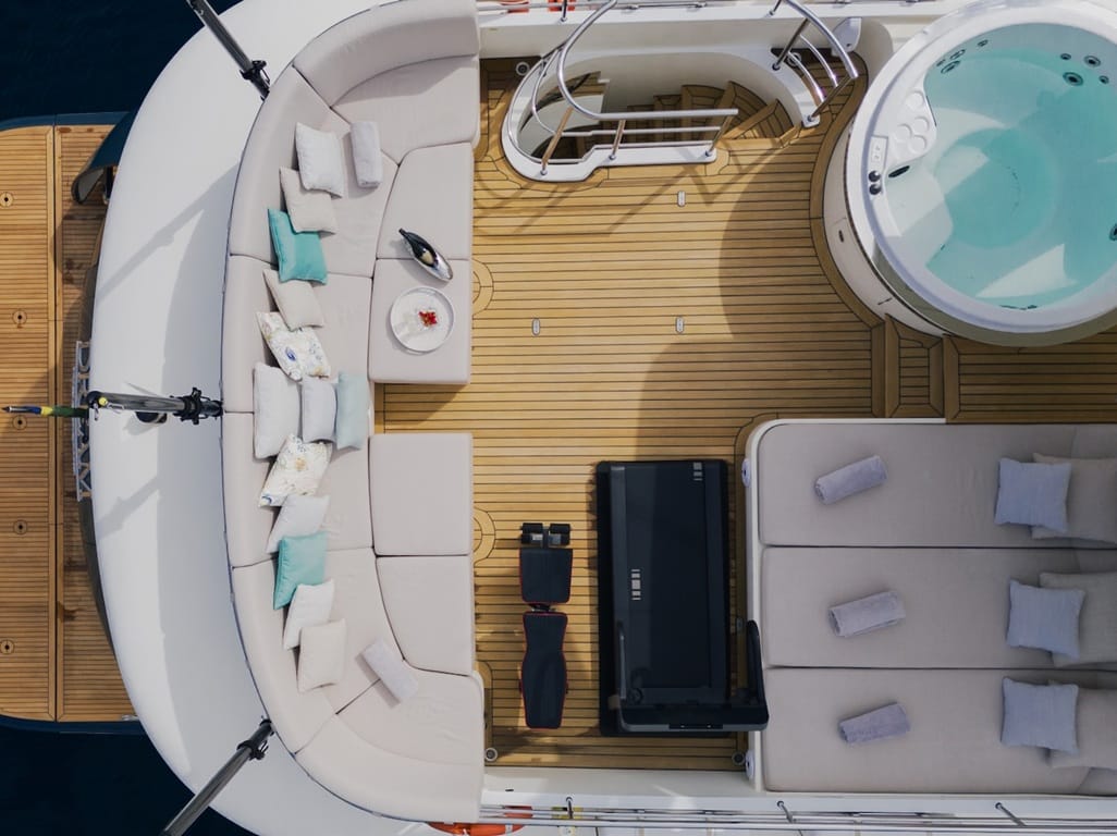Die Master-Suite auf dem Hauptdeck sowie zwei Doppel- und zwei Zweibettkabinen verfügen jeweils über Bad en suite und Klimaanlage. Außen erwarten Sie eine großzügige Flybridge mit Jacuzzi, ein gemütliches Cockpit und eine Sonnenfläche am Bug.