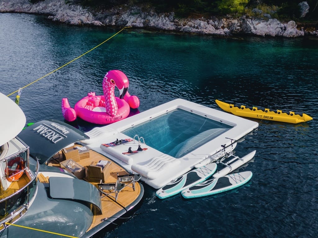 Mit Jetski, Wakeboard, SUP-Boards, Banana-Ride und 6-Meter-RIB ist Wasserspaß garantiert. Zwei Caterpillar C32-Motoren ermöglichen eine Reisegeschwindigkeit von 15 Knoten und bis zu 24 Knoten Spitze – für stilvolle Törns zu den schönsten Buchten der Adria.