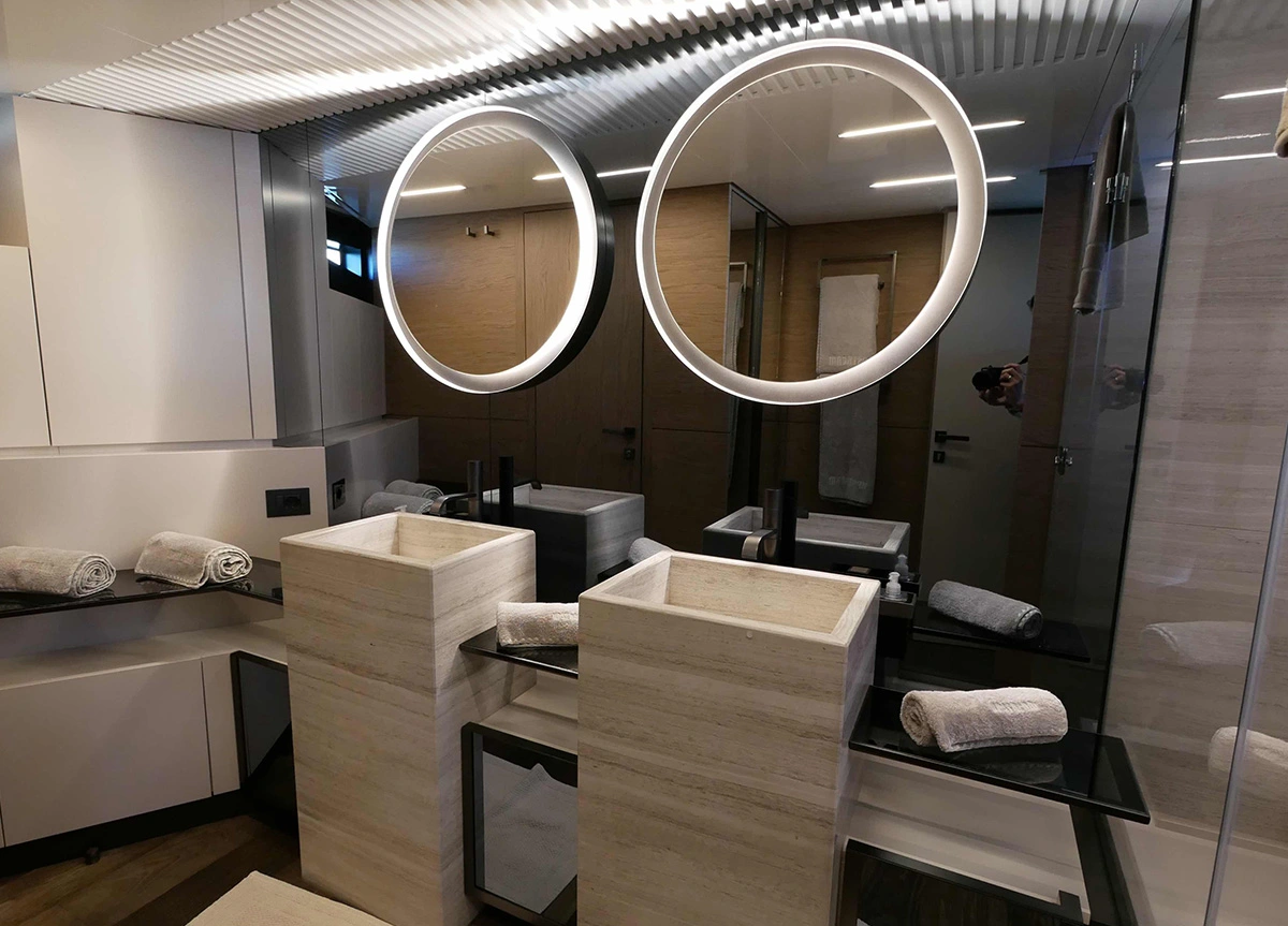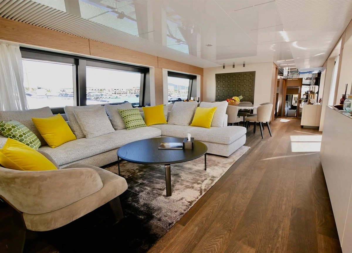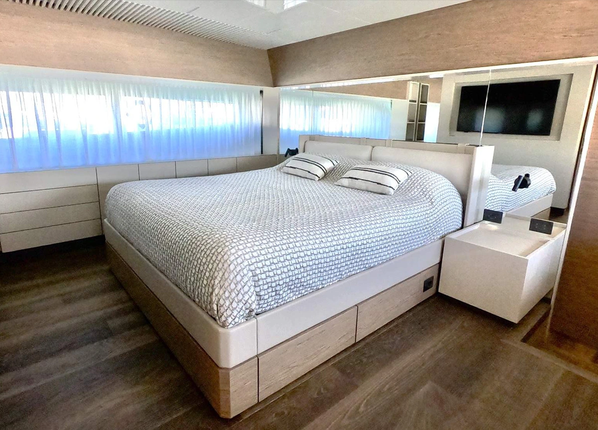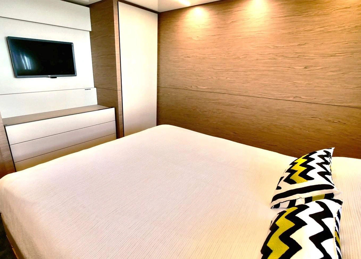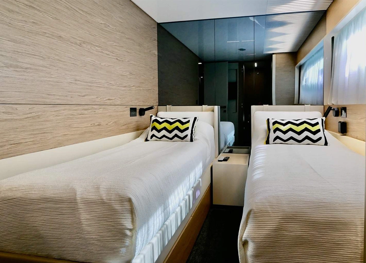 Das Interieur ist geschmackvoll und zeitlos gestaltet. Mit fünf Kabinen bietet UPSTREAM Platz für bis zu 11 Gäste in einer Master-Suite, zwei VIP-Kabinen und zwei Zweibett-Kabinen, von denen eine mit einem zusätzlichen Pullman-Bett ausgestattet ist.