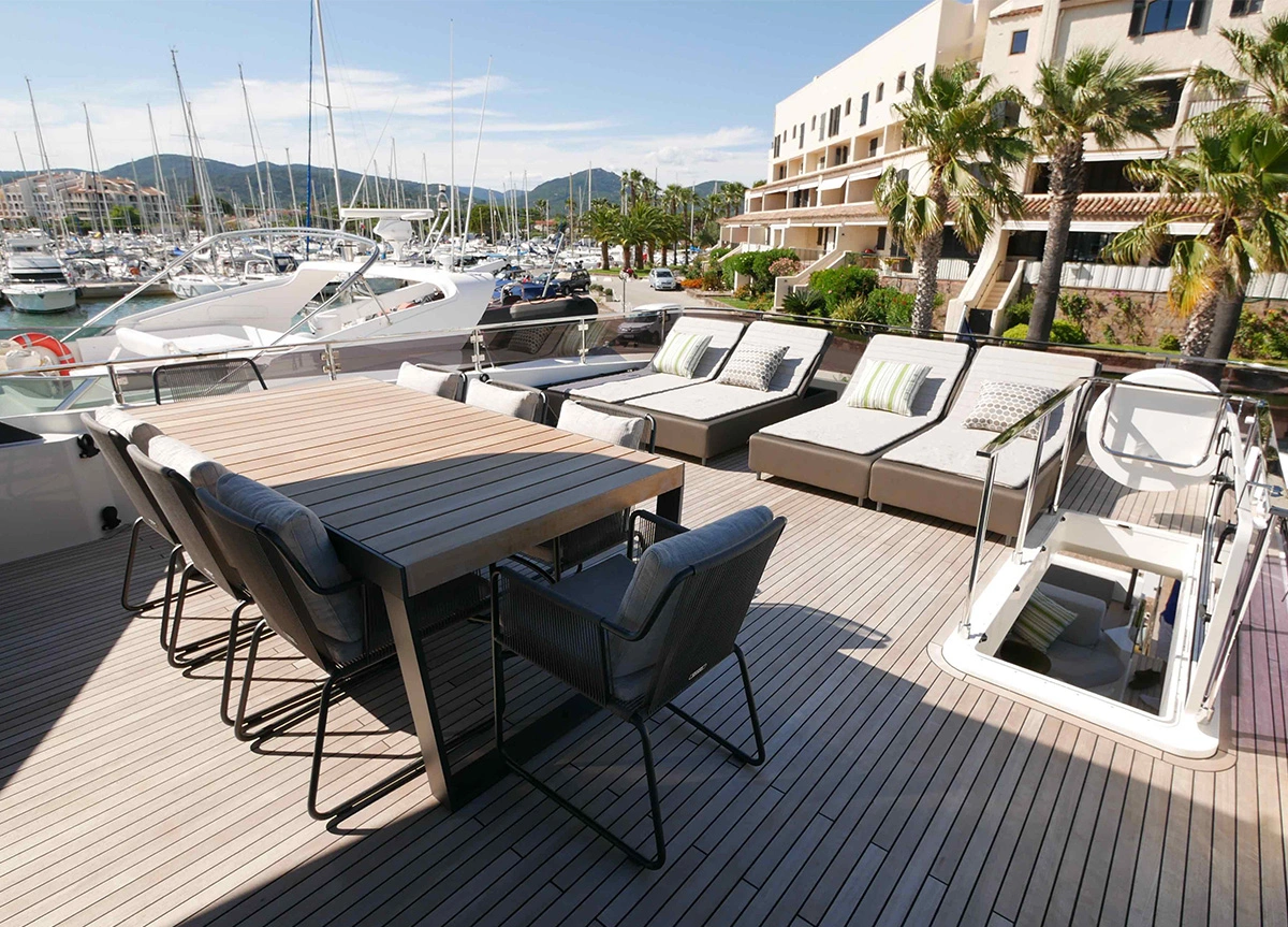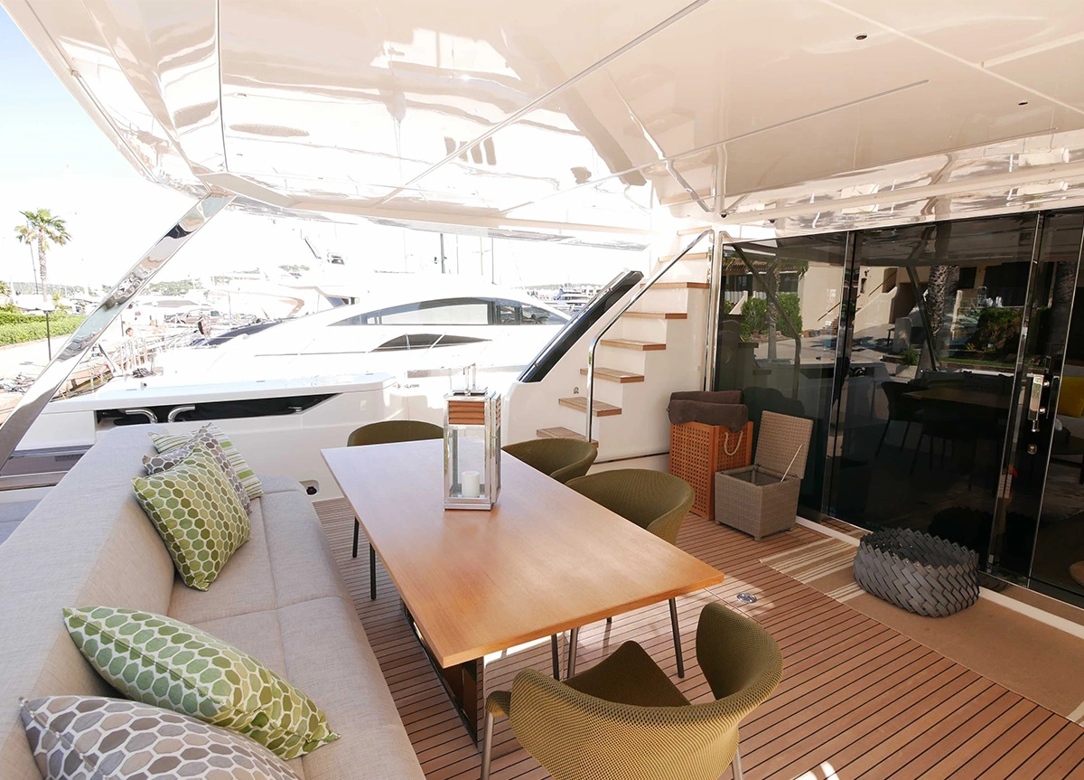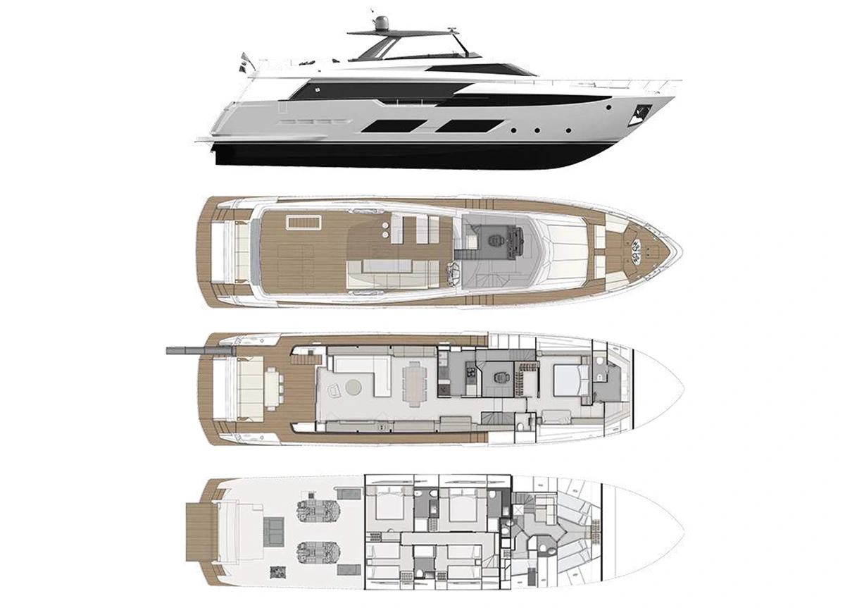 Die 2020er Ferretti 920 besticht durch ein bemerkenswertes Design in Kombination mit einer großartigen Leistung. Die Flybridge der Yacht bietet reichlich Platz zum Sonnenbaden und um den traumhaften mediterranen Sommer zu genießen.