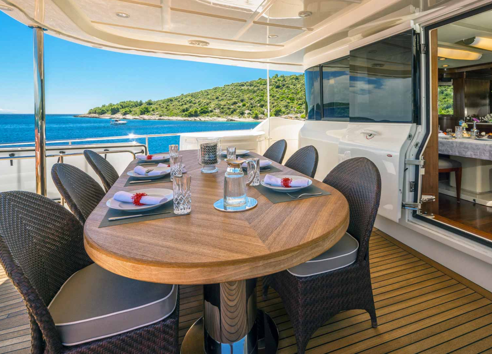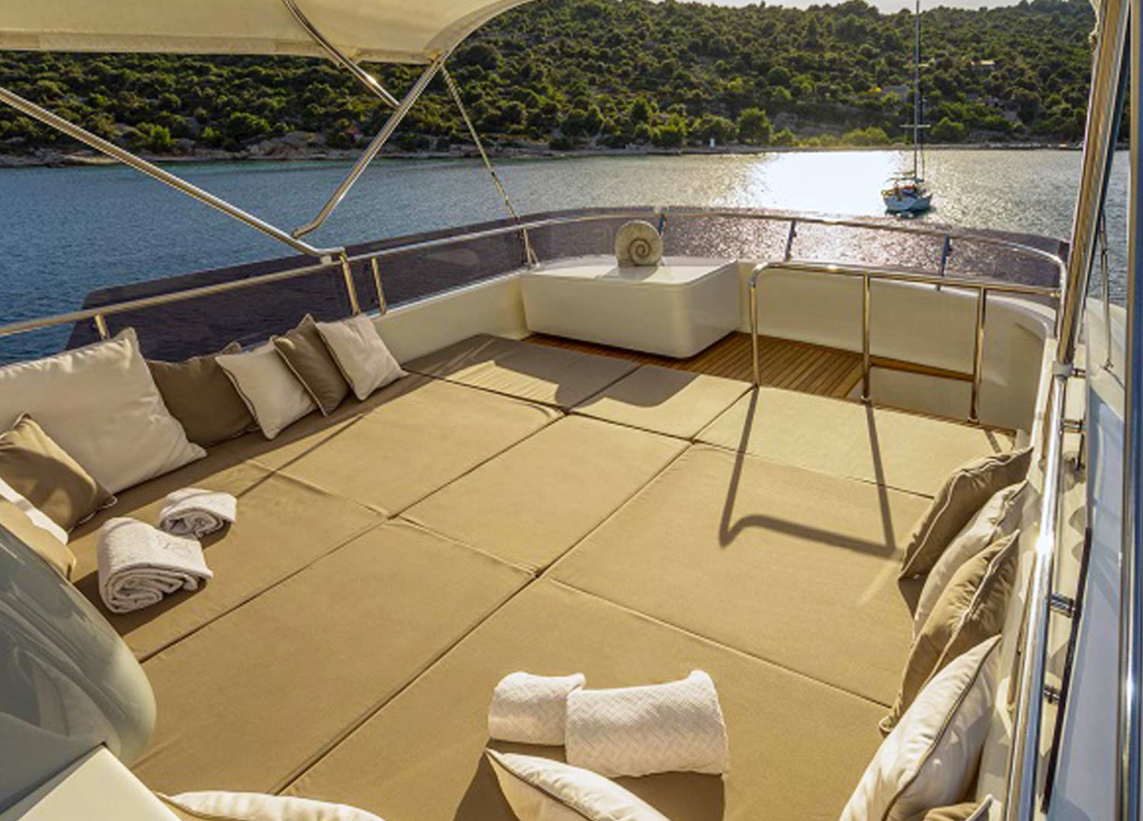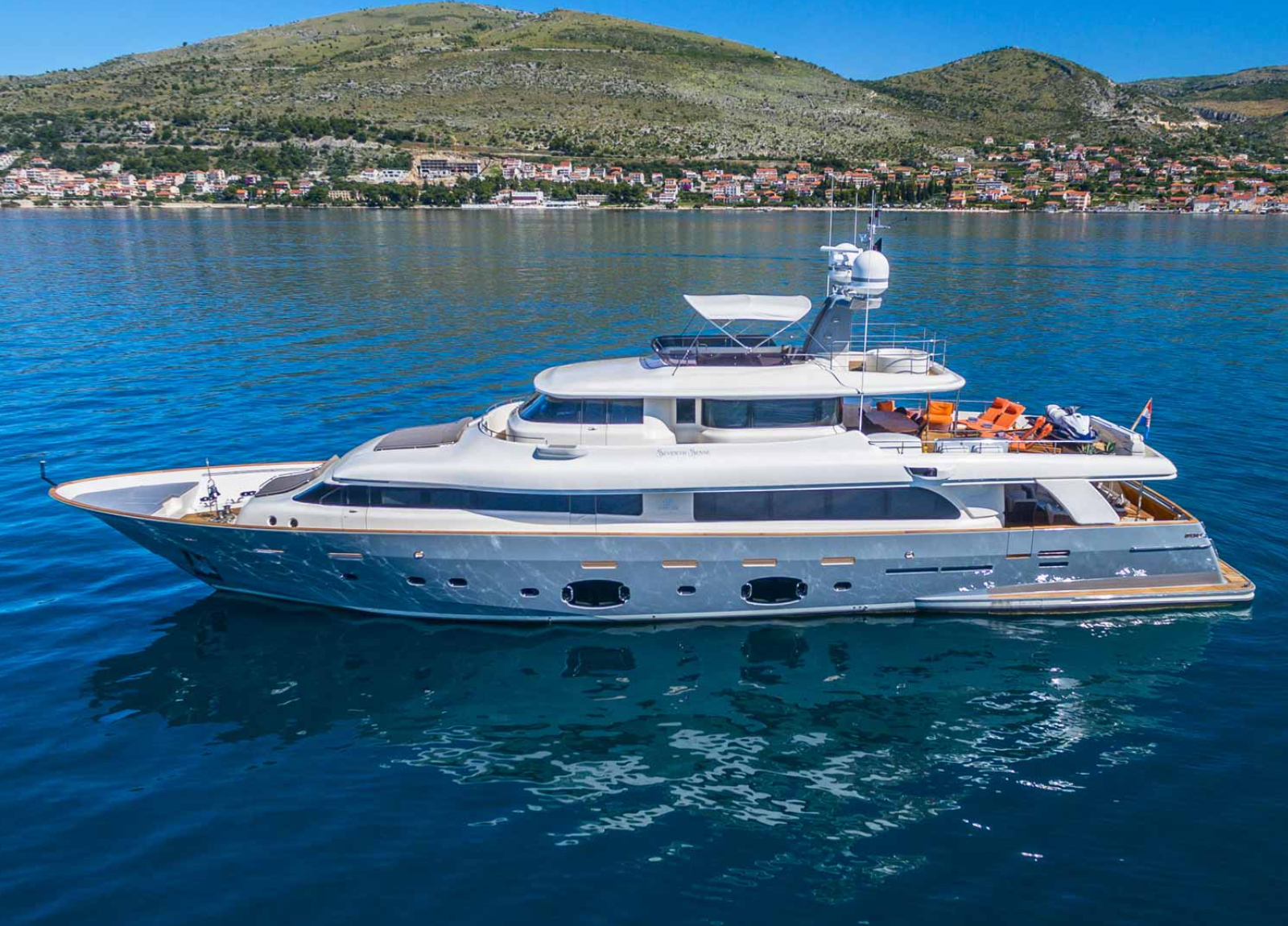 Mit ihren drei geräumigen Decks steht die Ferretti Navetta 33 “Seventh Sense” für großzügigen Lebensraum und besonderen Stil dank ihres Innen- und Außendesigns von Zuccon International. Die Yacht navigiert bequem die kroatischen Gewässer mit Stabilisatoren in Fahrt und vor Anker. Sie bietet Platz für 10 Gäste in 5 Kabinen, darunter eine Masterkabine mit begehbarem Kleiderschrank auf dem Hauptdeck sowie zwei VIP-Kabinen und zwei Zweibettkabinen auf dem Unterdeck. Ihr großzügiges Wassersportangebot rundet das Erlebnis perfekt ab.