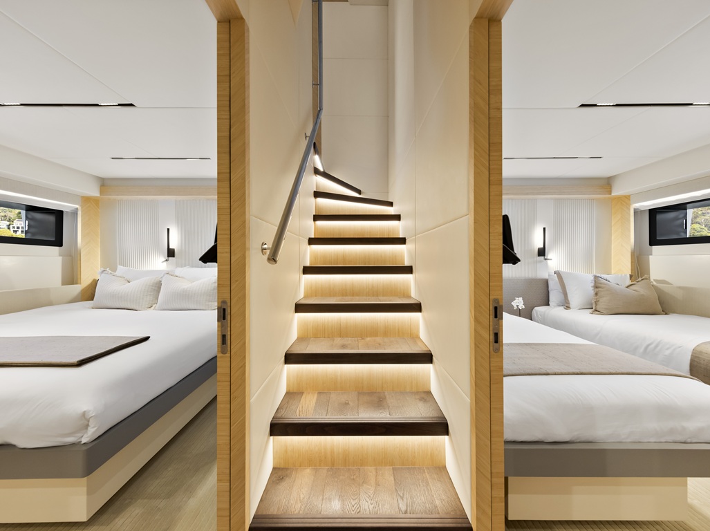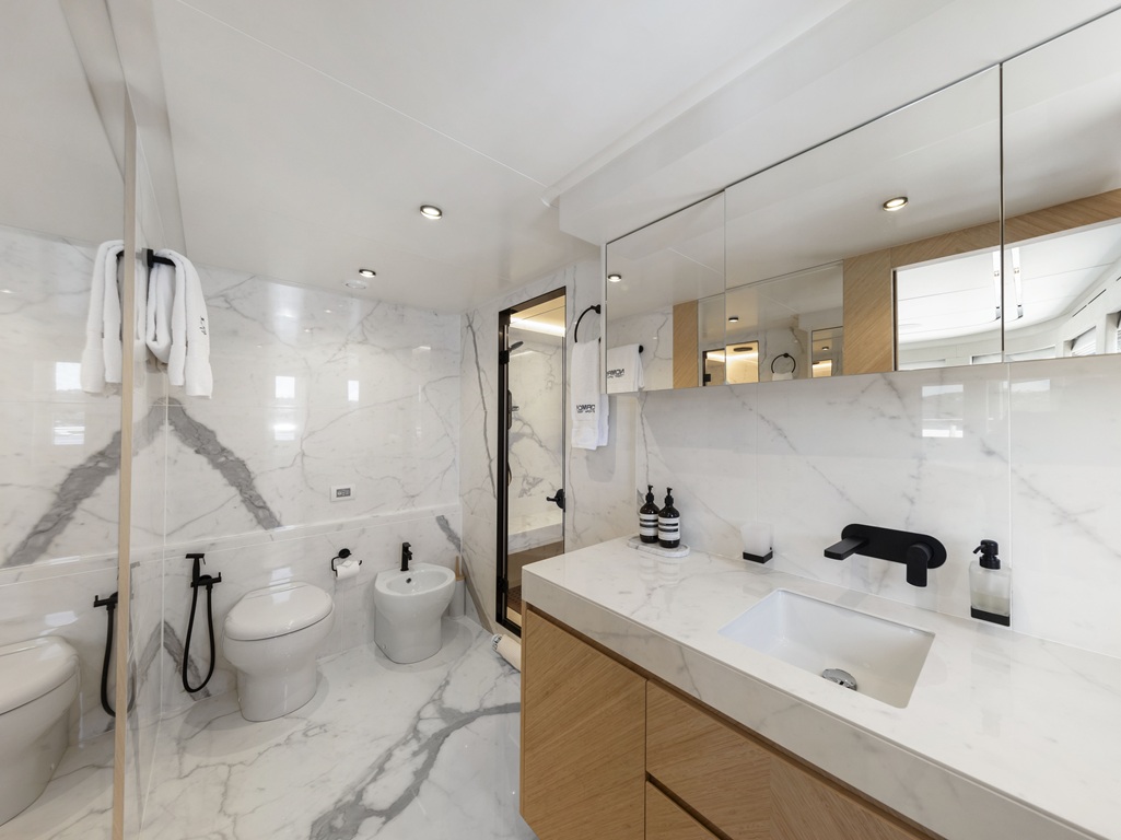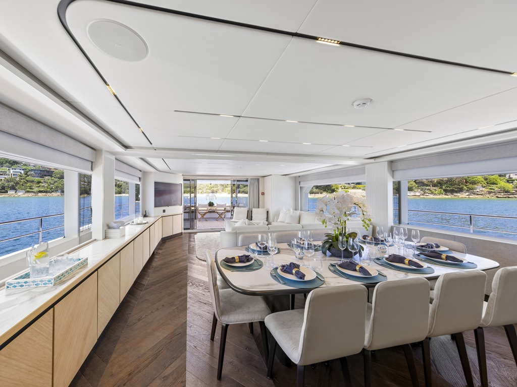 Im Inneren überzeugt die Yacht mit einer harmonischen Kombination aus Komfort und Eleganz. Die geschmackvoll eingerichteten Kabinen bieten einen ruhigen Rückzugsort zum Entspannen nach einem erlebnisreichen Tag. Der geräumige Main Salon ist mit modernen Entertainment-Systemen und luxuriösen Sitzgelegenheiten ausgestattet und schafft eine einladende Atmosphäre zum Relaxen und geselligen Beisammensein.
