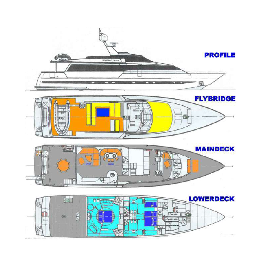 Die Heartbeat of Life bietet Platz für 7 Übernachtungsgäste, aufgeteilt in eine Master-Kabine, eine VIP-Kabine und eine Gäste-Kabine mit zwei Einzelkojen und einem Pullman.