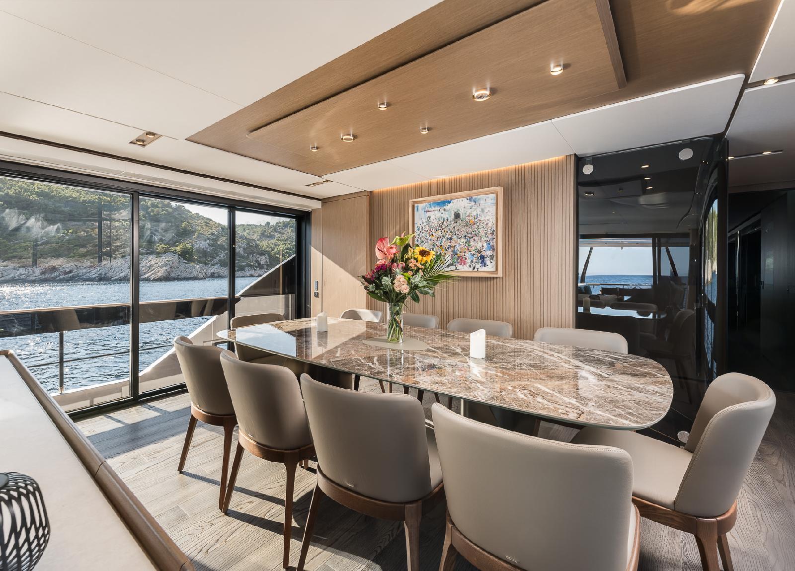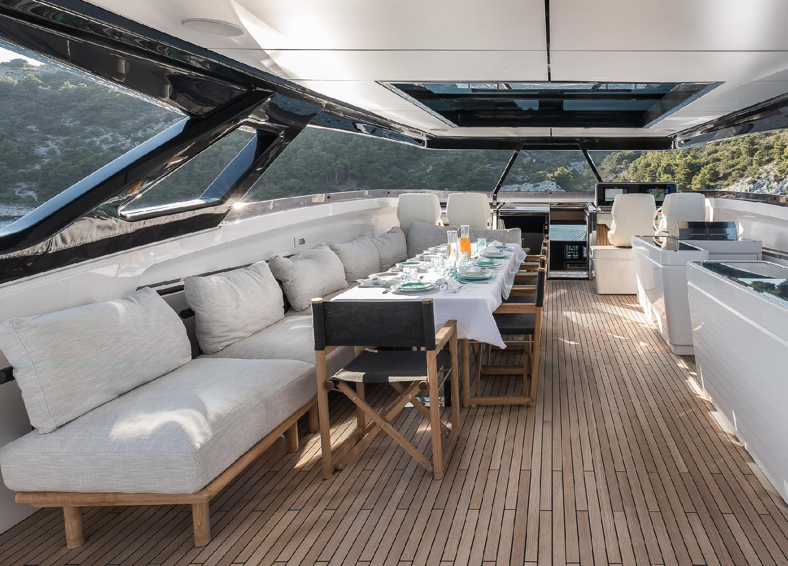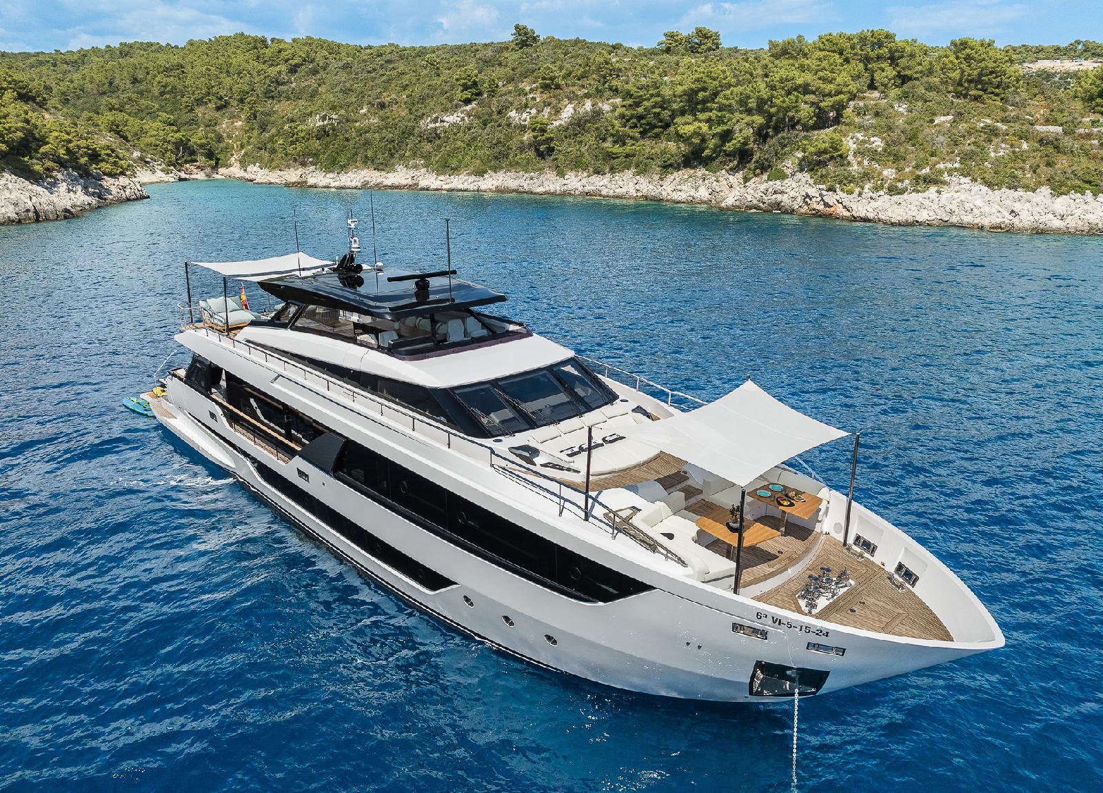 Diese luxuriöse Motoryacht von Ferretti, Baujahr 2024, bietet Platz für 10 Gäste.