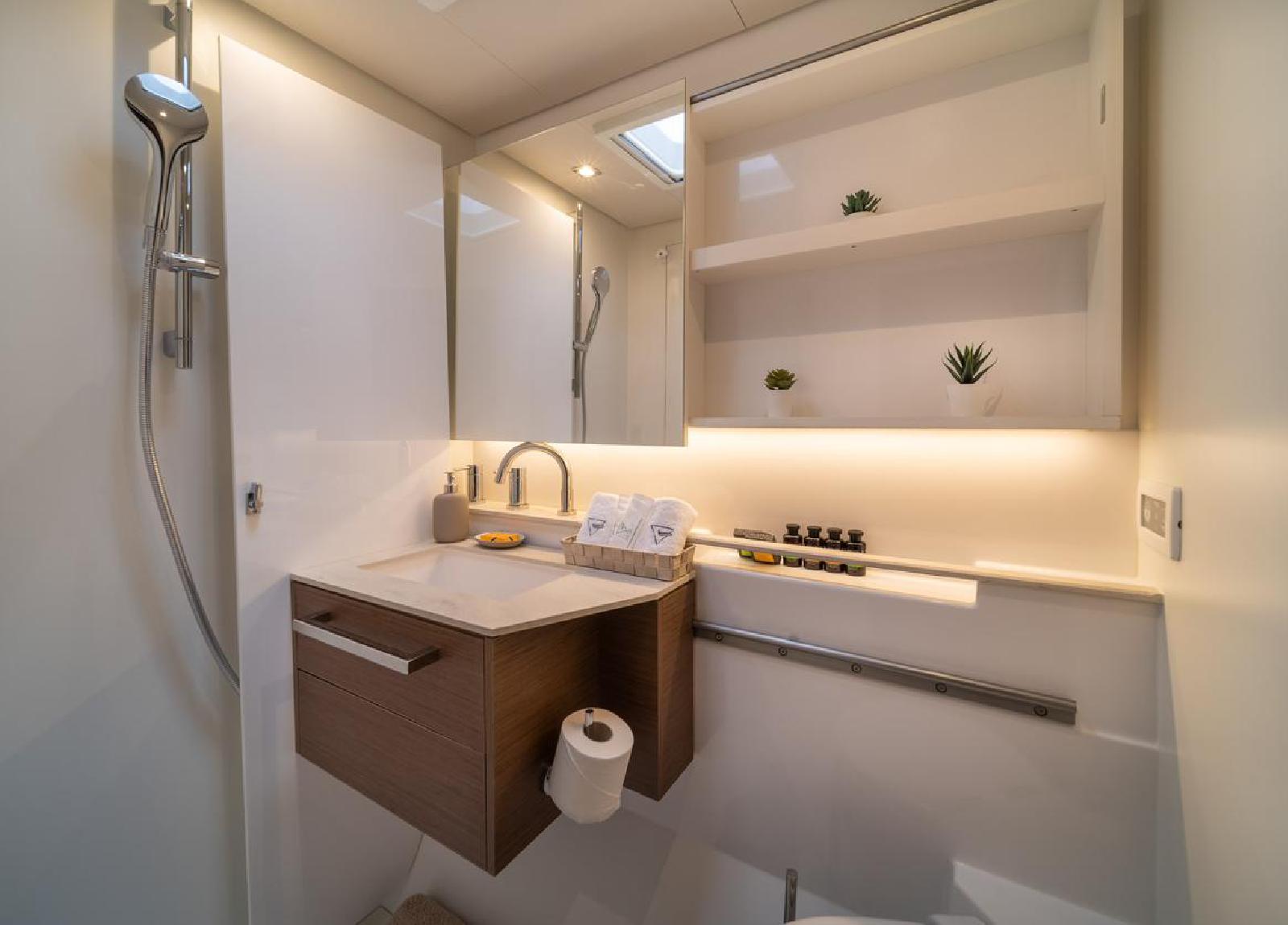 Mit 5 geräumigen Kabinen, darunter 4 Doppel- und einer Twin-Kabine, die sich in eine Doppel-Kabine umwandeln lässt, bietet die Lagoon 55 viel Platz für für Ihren Charter mit Familie und Freunde.
