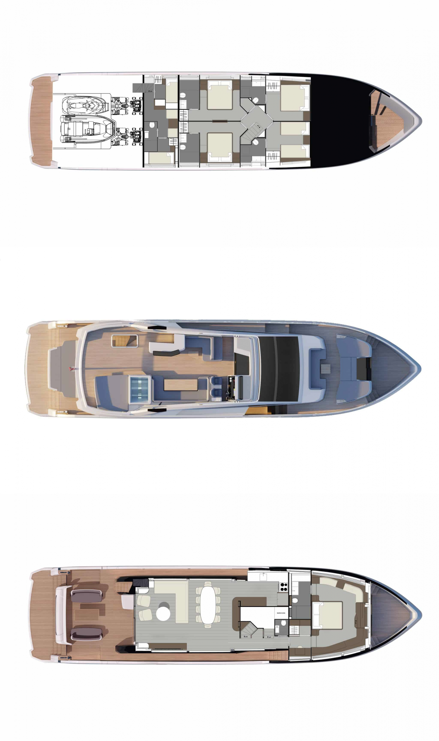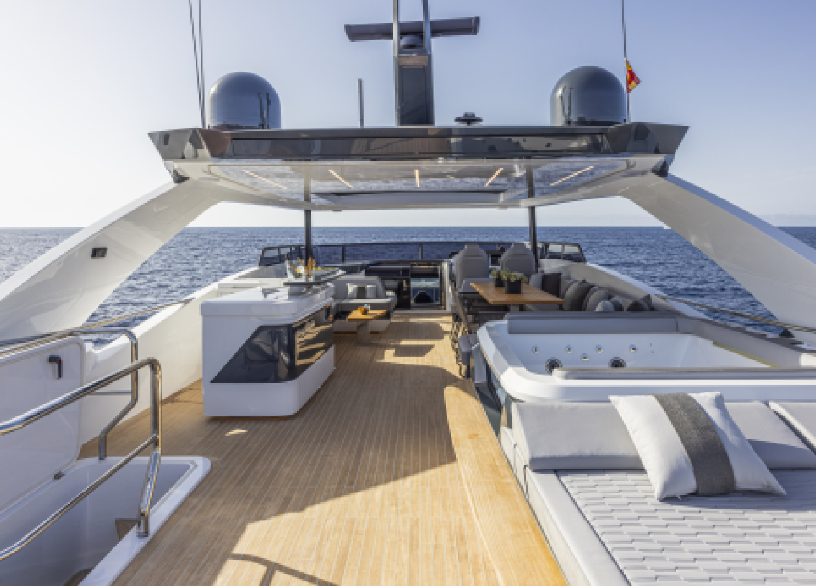 Zu den Highlights zählen eine großzügige Master-Suite mit privater Terrasse im Bug, eine Tender-Garage für ein Williams 345, sowie weitläufige Außenbereiche wie die Flybridge, eine Lounge mit Bar, Sonnendeck und Spa-Pool. Im Inneren sorgen ein offenes Layout und bodentiefe Fenster für lichtdurchflutete Räume mit Meerblick. Die Pearl 82 bietet Platz für bis zu zehn Gäste und erreicht eine Höchstgeschwindigkeit von 33 Knoten. Damit verbindet sie Eleganz, Komfort und Performance auf höchstem Niveau.