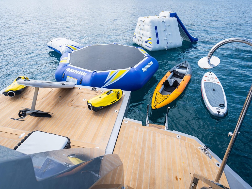 Auch in puncto Wassersport setzt die „Pandion Pearl“ Maßstäbe: Zur festen Ausstattung gehören zwei Williams Tenders (635 und 345), ein Seadoo GTX 300 Jetski, drei Seabobs, zwei Fliteboards, zwei Kajaks, zwei SUPs, Wasserski, Wakeboards, ein Flyboard, Towables wie Donut & Screamer sowie aufblasbare Badeplattformen mit Dockingstationen für Jetskis und Seabobs. Auf Wunsch stehen zusätzliche Highlights zur Verfügung – darunter eine aufblasbare Pyramide mit Rutsche, ein Trampolin und drei schwimmende Pontons.