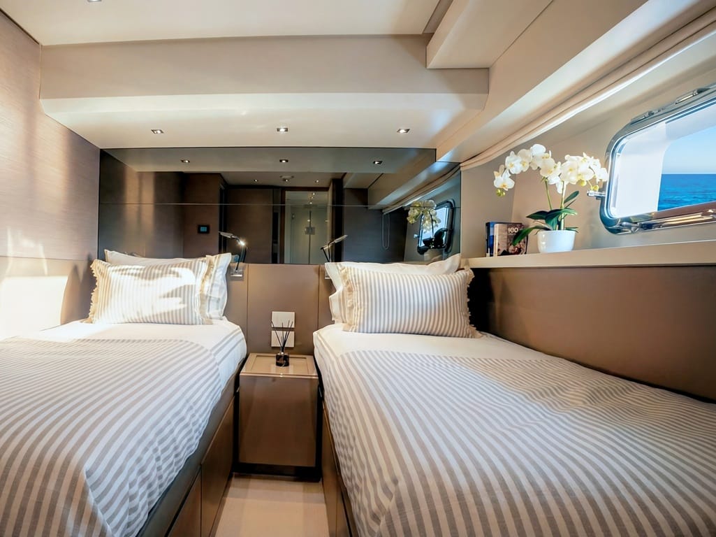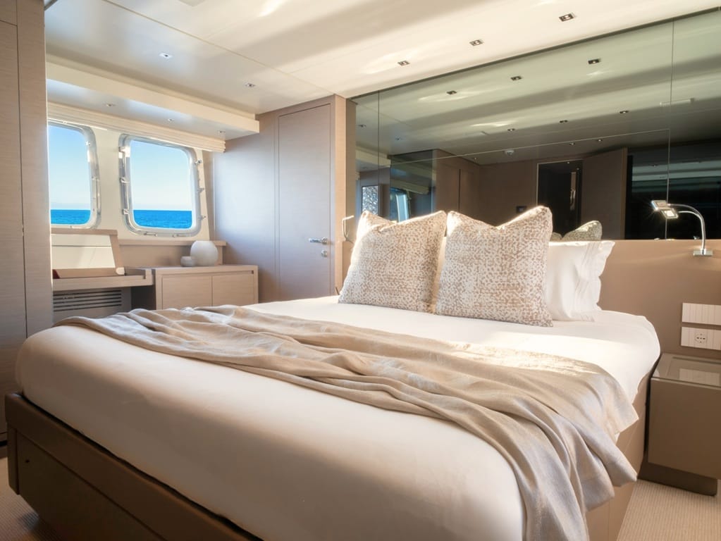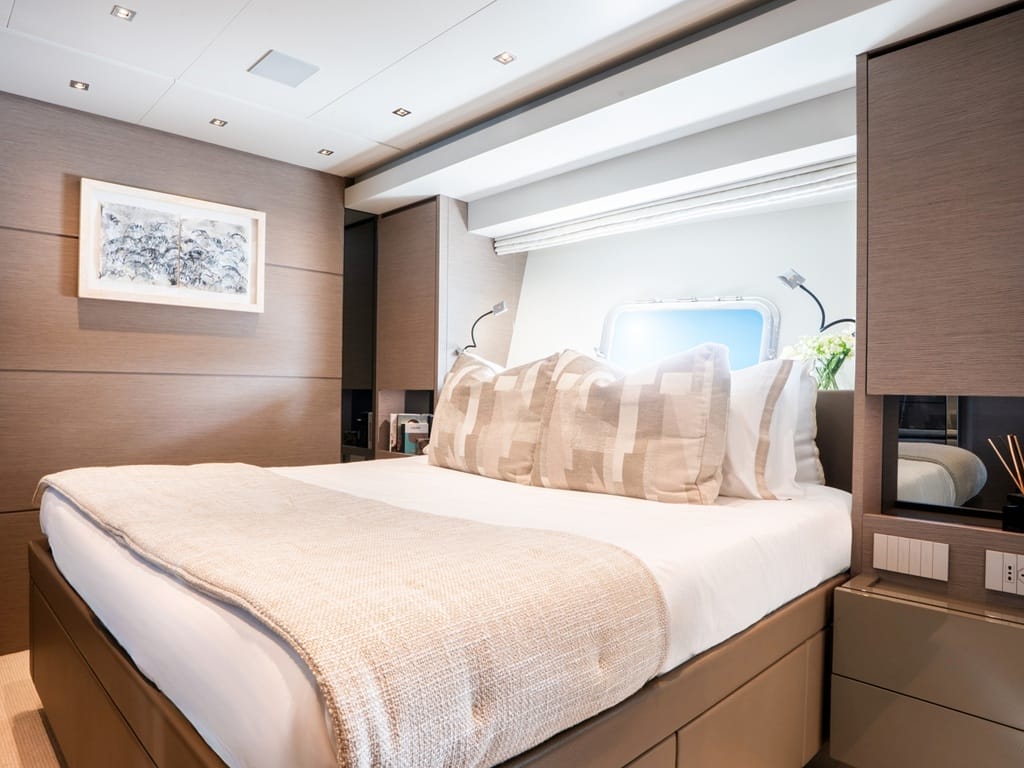 An Bord finden bis zu 8 Gäste in 4 luxuriösen Kabinen mit eigenem Bad Platz – darunter eine weitläufige Masterkabine über die gesamte Breite, eine VIP-Doppelkabine, eine Twin-Kabine sowie eine Kabine mit Etagenbetten. Eine professionelle Crew aus 3 Personen sorgt rund um die Uhr für erstklassigen Service und ein unvergessliches Chartererlebnis.