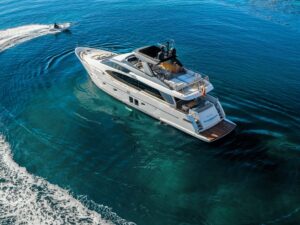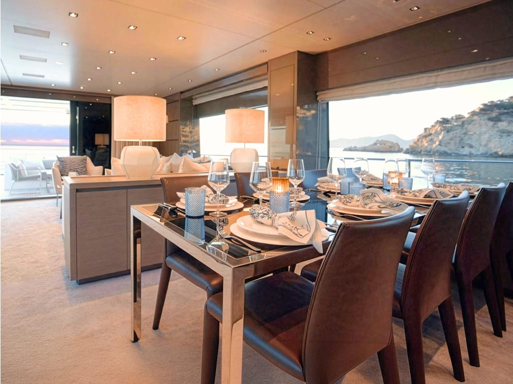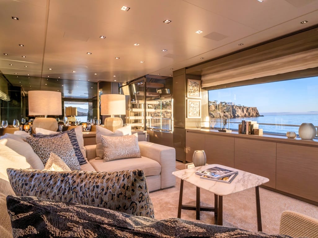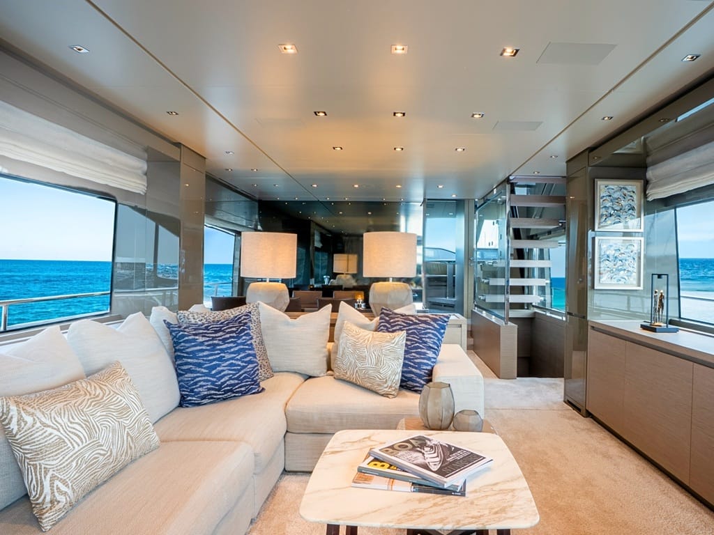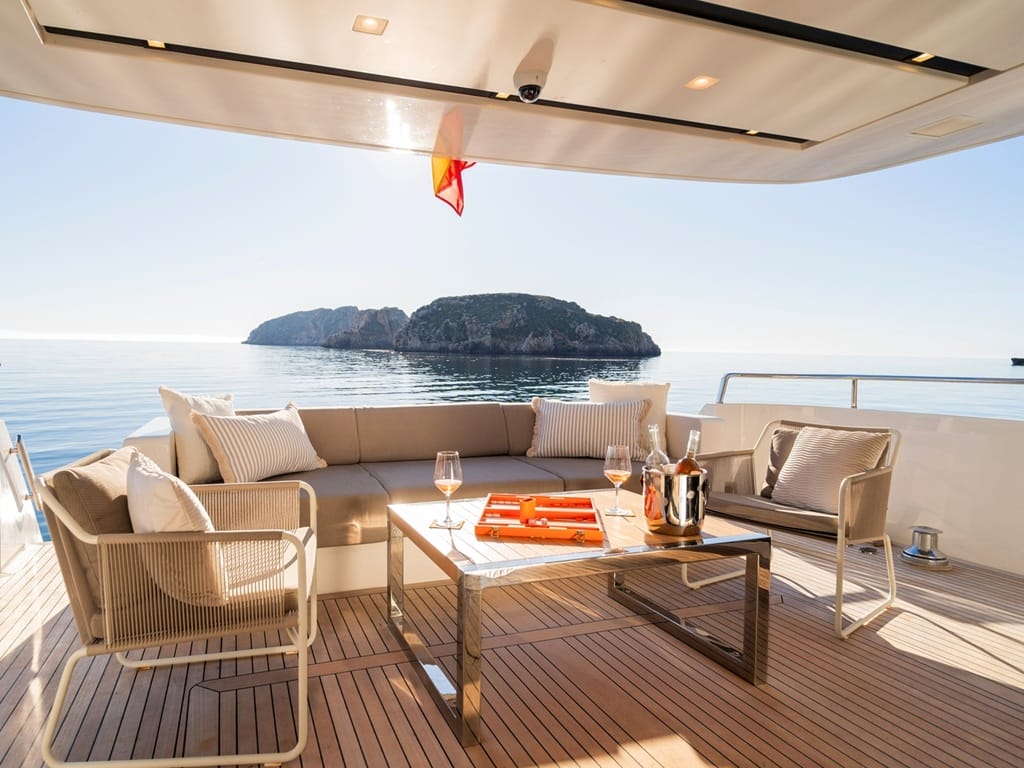 Der Salon mit seinen großen Panoramafenstern schafft eine ruhige, zeitgemäße Atmosphäre, während die Flybridge mit Essbereich, Lounge und Bar sowie das einladende Vorschiff exklusive Rückzugsorte zum Sonnenbaden und Entspannen bieten.