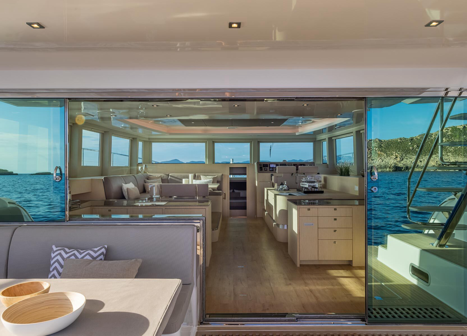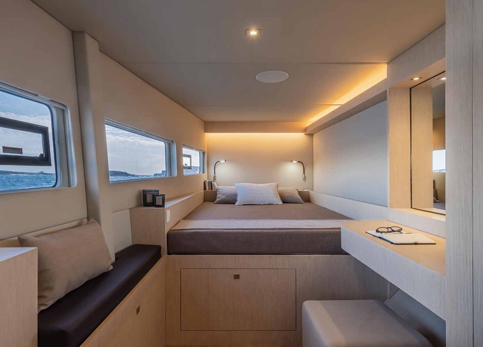 Der hochmoderne, stilvolle Katamaran verfügt über drei Gästekabinen für sechs Personen mit großen Fenstern und den neuesten Annehmlichkeiten, jeweils mit en-suite Badezimmer.