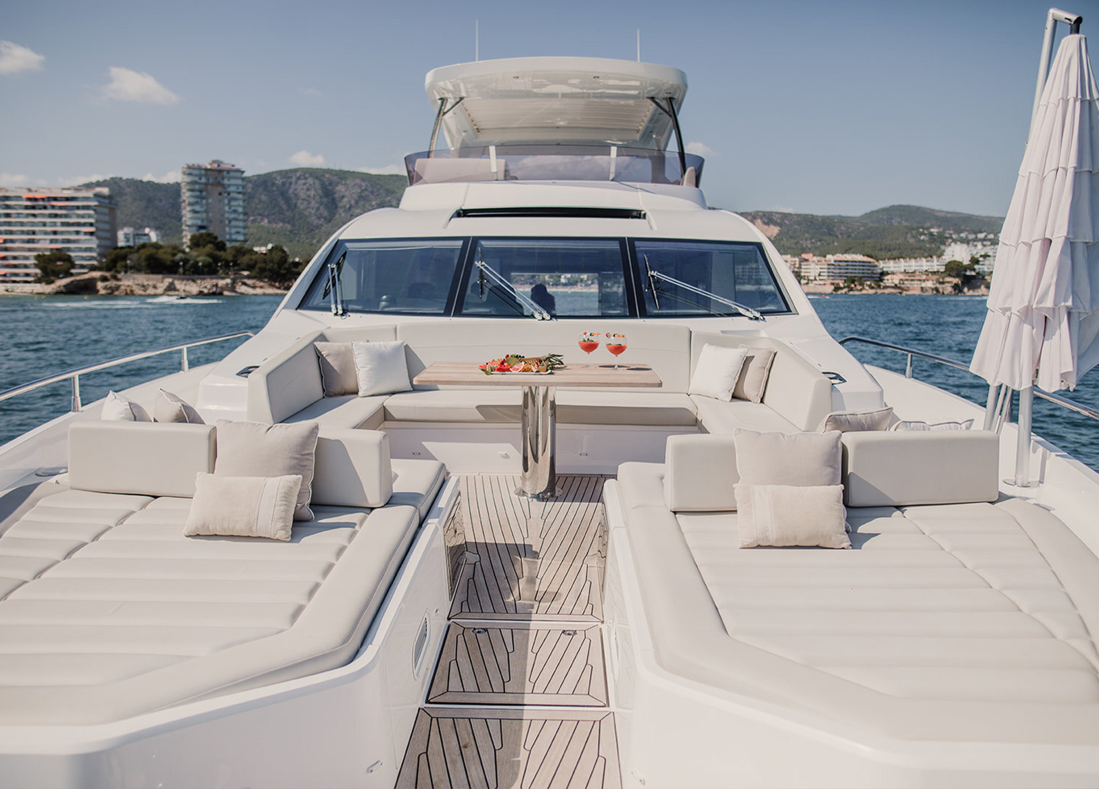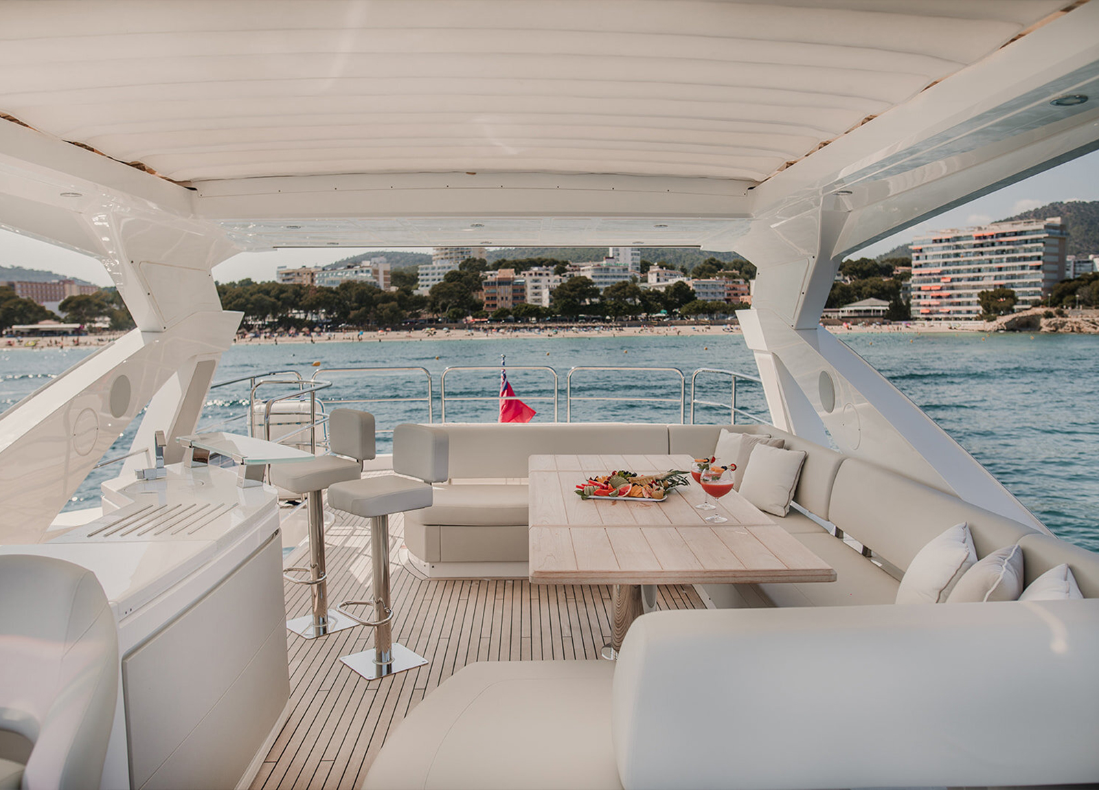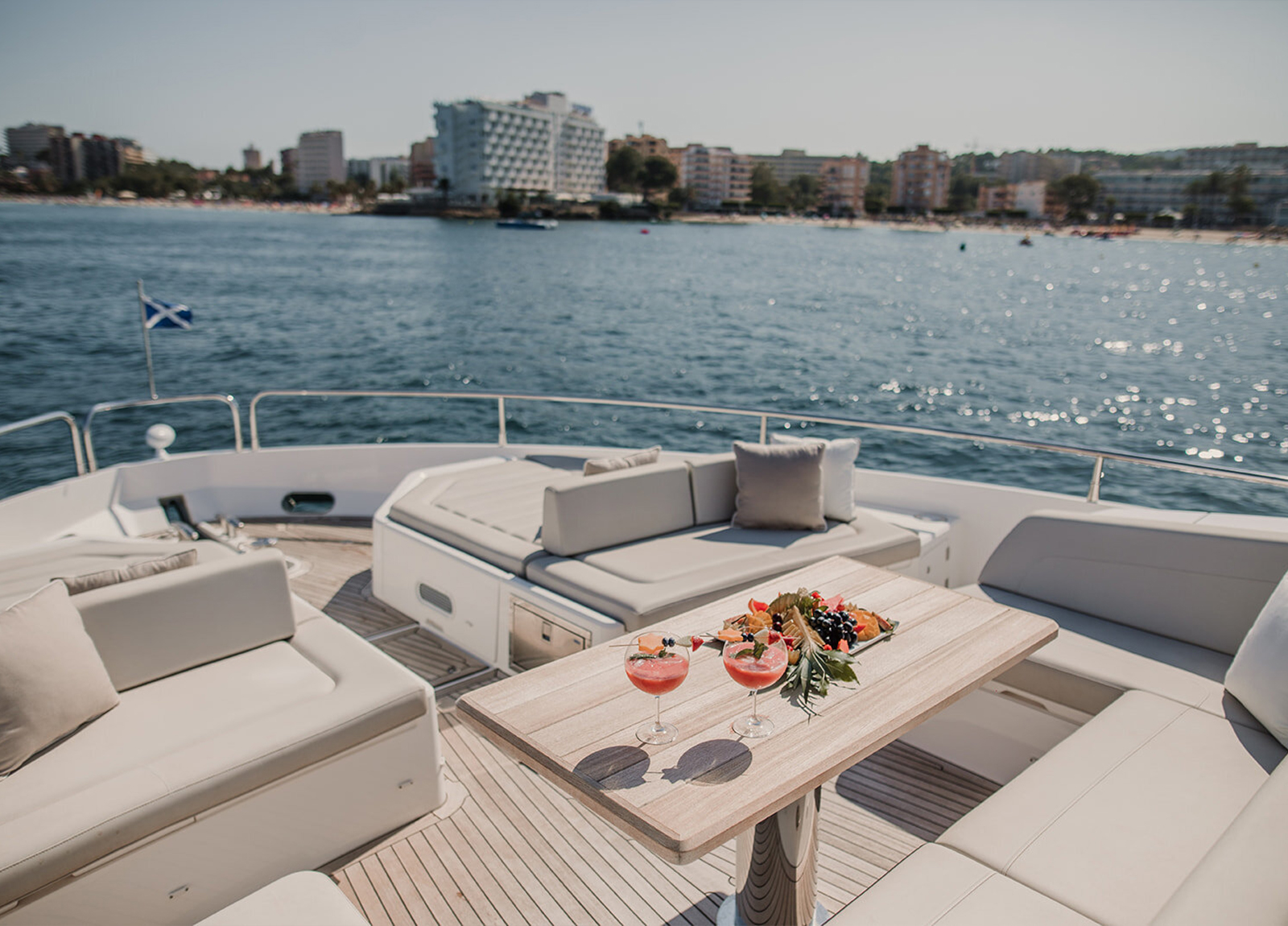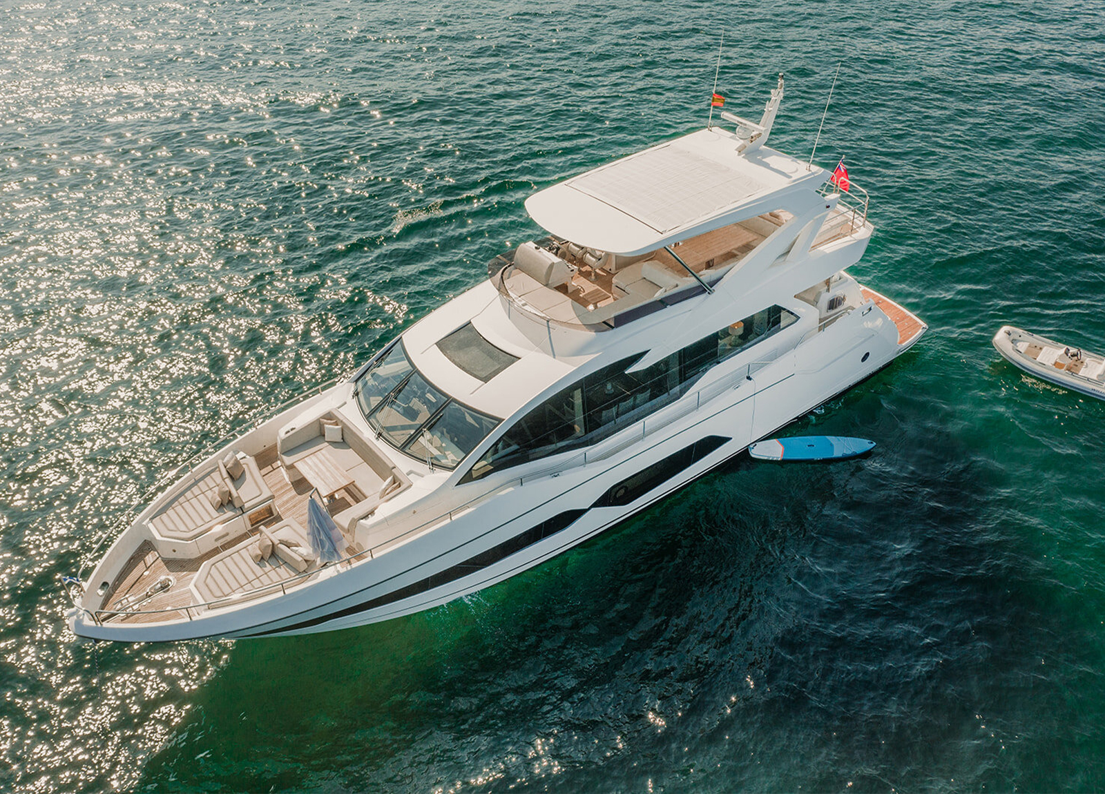 Die MY Sunseeker 76 Lady M ist eine sportliche Luxusyacht für den ganz besonderen Charterurlaub auf den Balearen. Sie bietet Platz für maximal 8 Gäste in 4 Kabinen mit jeweils eigenem Bad. Die Master-Suite, eine VIP-Kabine und 2 weitere Gäste-Kabinen. Die Master-Suite befindet sich mittschiffs auf dem unteren Deck, um die volle Breite nutzen zu können. Sie bietet ein Doppelbett, TV, ein Sofa, Schreibtisch und einen begehbaren Kleiderschrank. Hinzu kommt ein Badezimmer mit zwei Waschbecken, einer Toilette und einer Dusche. Die VIP-Kabine befindet sich im Bug und verfügt über ein Doppelbett mit TV, einem Schreibtisch und Kleiderschrank, ebenso wie ein eigenes Bad mit Waschbecken, Toilette und Dusche. Der Bereich mittschiffs bietet eine Doppelkabine an Steuerbord und eine weitere umbaubare Doppelkabine an Backbord. Beide haben TV, Kleiderschrank und ein eigenes Bad mit Waschbecken, Toilette und Dusche. Die Doppelkabine verfügt außerdem über einen Schreibtisch. Das Fin-Stabilizer-System sorgt für ruhige Tage und Nächte auf See. Auf der großzügigen Flybridge finden sich Sonnenliegen, eine großzügige Sitzgruppe – sowie eine Wetbar. Eine Auswahl an Wassersport-Equipment sorgen für den nötigen sportlichen Ausgleich und Spaß im Wasser. Die professionelle 3-köpfige Besatzung kümmert sich während der gesamten Kreuzfahrt um jedes noch so kleine Detail.