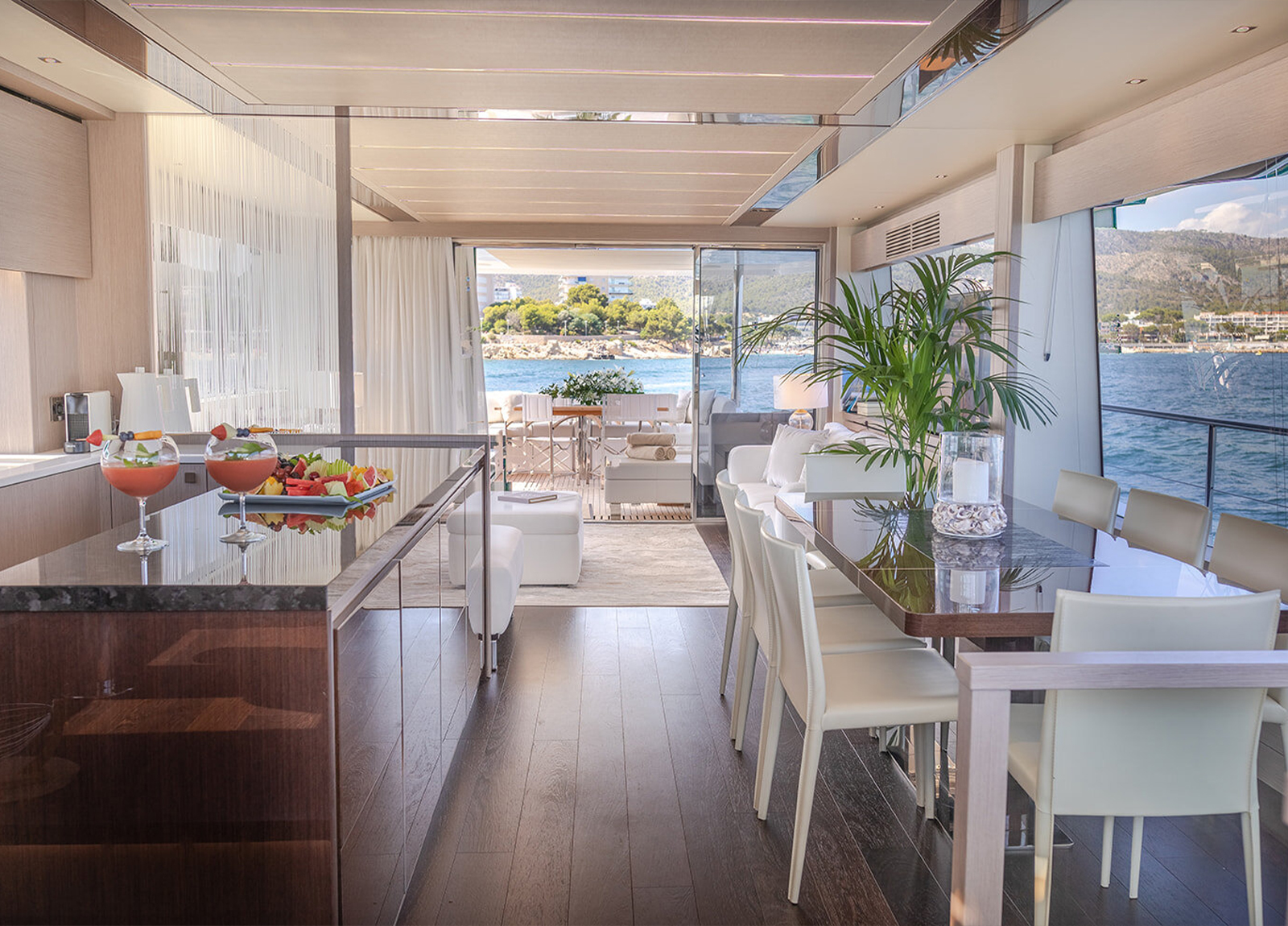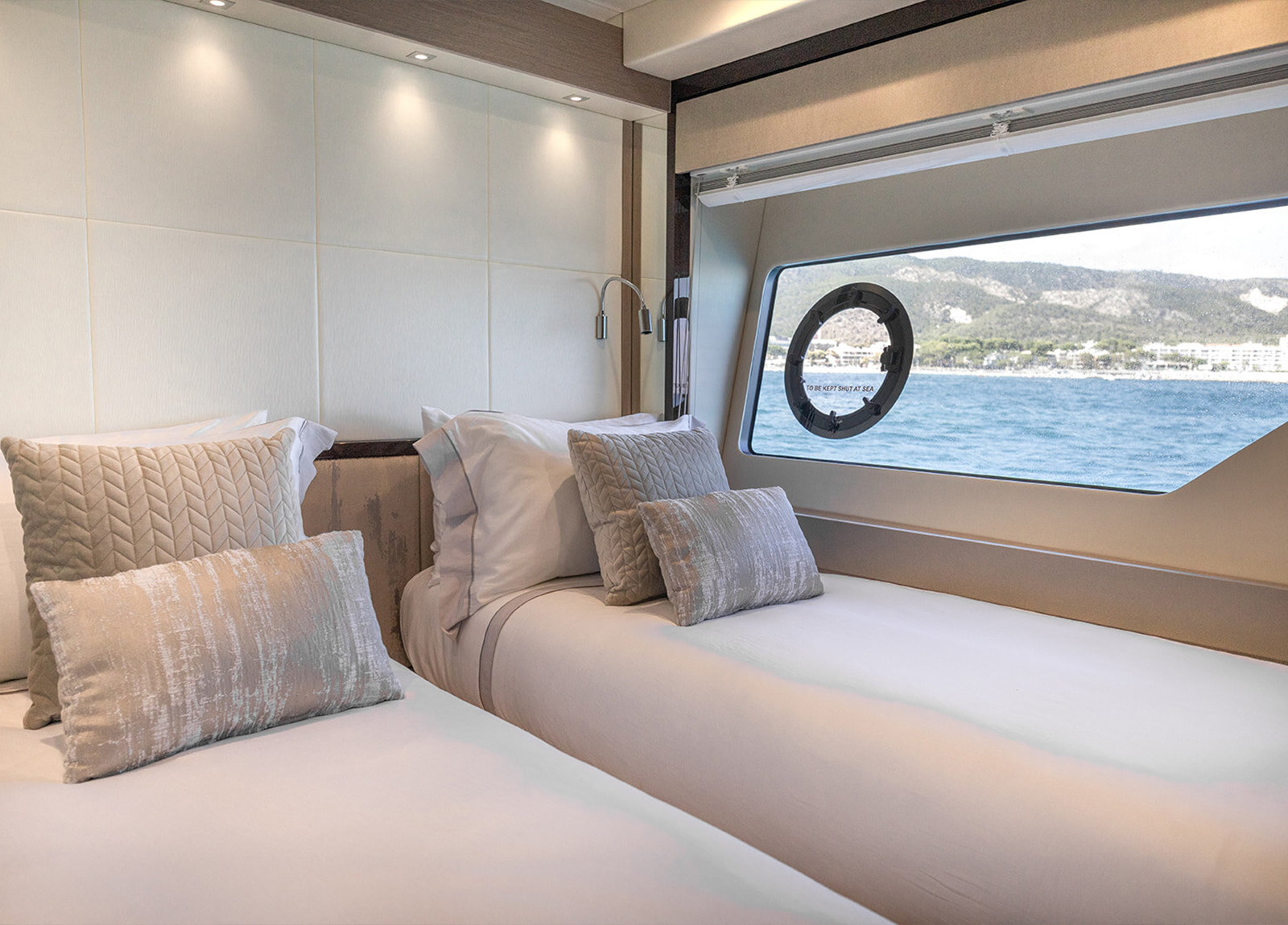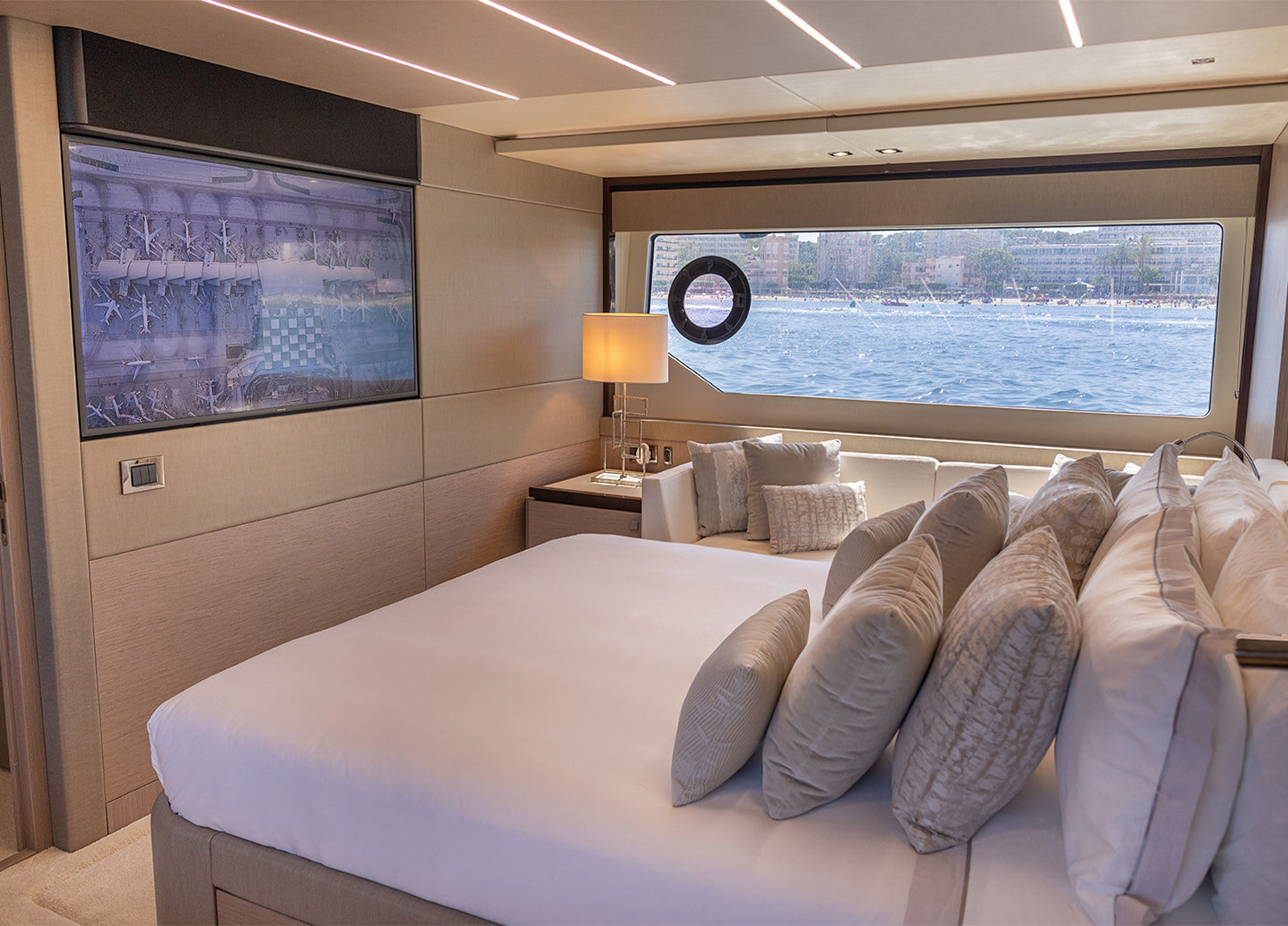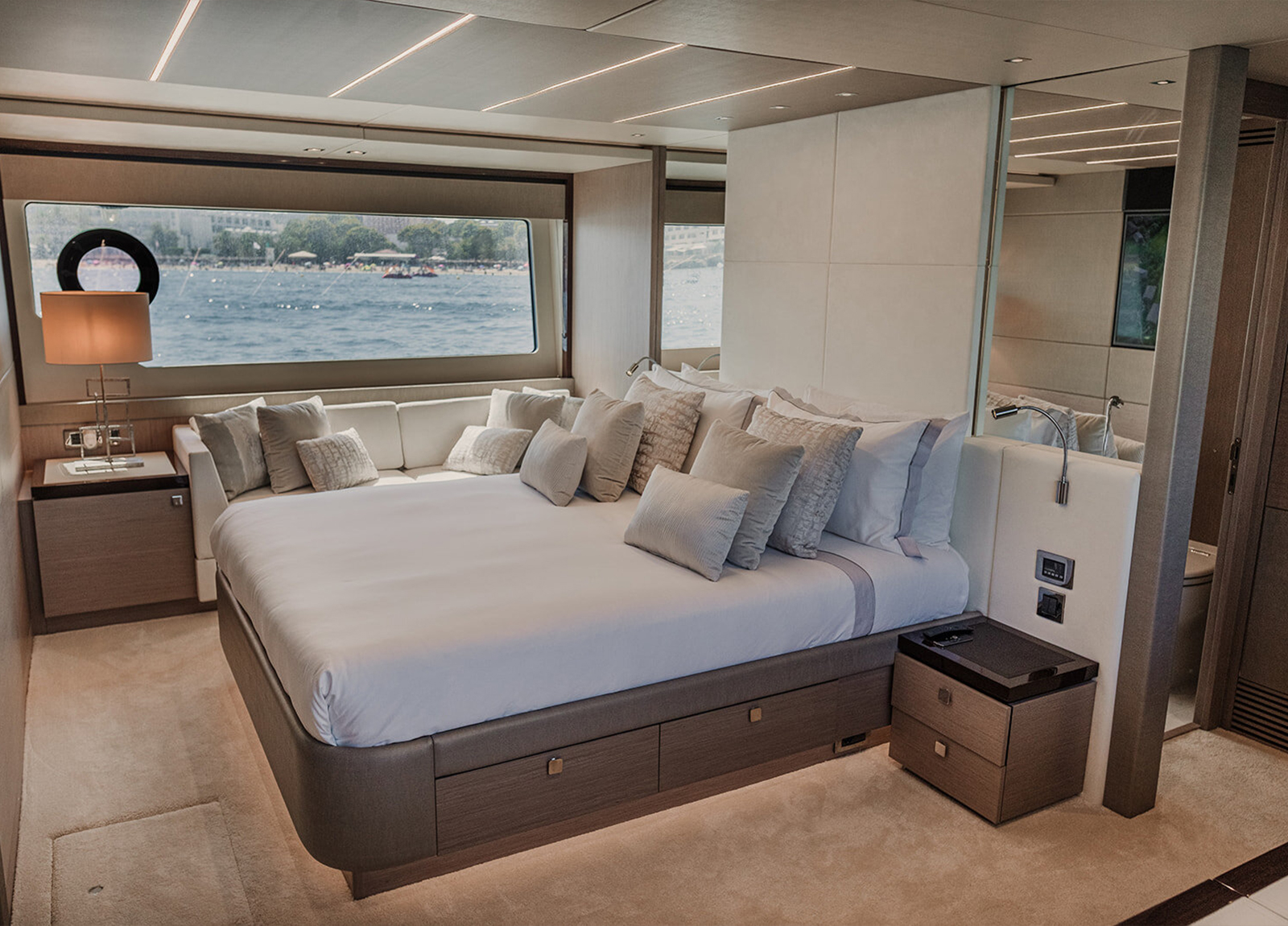 Die MY Sunseeker 76 Lady M ist eine sportliche Luxusyacht für den ganz besonderen Charterurlaub auf den Balearen. Sie bietet Platz für maximal 8 Gäste in 4 Kabinen mit jeweils eigenem Bad. Die Master-Suite, eine VIP-Kabine und 2 weitere Gäste-Kabinen. Die Master-Suite befindet sich mittschiffs auf dem unteren Deck, um die volle Breite nutzen zu können. Sie bietet ein Doppelbett, TV, ein Sofa, Schreibtisch und einen begehbaren Kleiderschrank. Hinzu kommt ein Badezimmer mit zwei Waschbecken, einer Toilette und einer Dusche. Die VIP-Kabine befindet sich im Bug und verfügt über ein Doppelbett mit TV, einem Schreibtisch und Kleiderschrank, ebenso wie ein eigenes Bad mit Waschbecken, Toilette und Dusche. Der Bereich mittschiffs bietet eine Doppelkabine an Steuerbord und eine weitere umbaubare Doppelkabine an Backbord. Beide haben TV, Kleiderschrank und ein eigenes Bad mit Waschbecken, Toilette und Dusche. Die Doppelkabine verfügt außerdem über einen Schreibtisch. Das Fin-Stabilizer-System sorgt für ruhige Tage und Nächte auf See. Auf der großzügigen Flybridge finden sich Sonnenliegen, eine großzügige Sitzgruppe – sowie eine Wetbar. Eine Auswahl an Wassersport-Equipment sorgen für den nötigen sportlichen Ausgleich und Spaß im Wasser. Die professionelle 3-köpfige Besatzung kümmert sich während der gesamten Kreuzfahrt um jedes noch so kleine Detail.