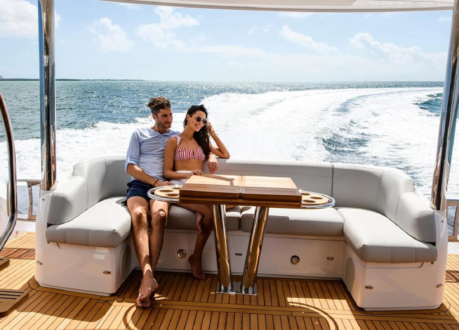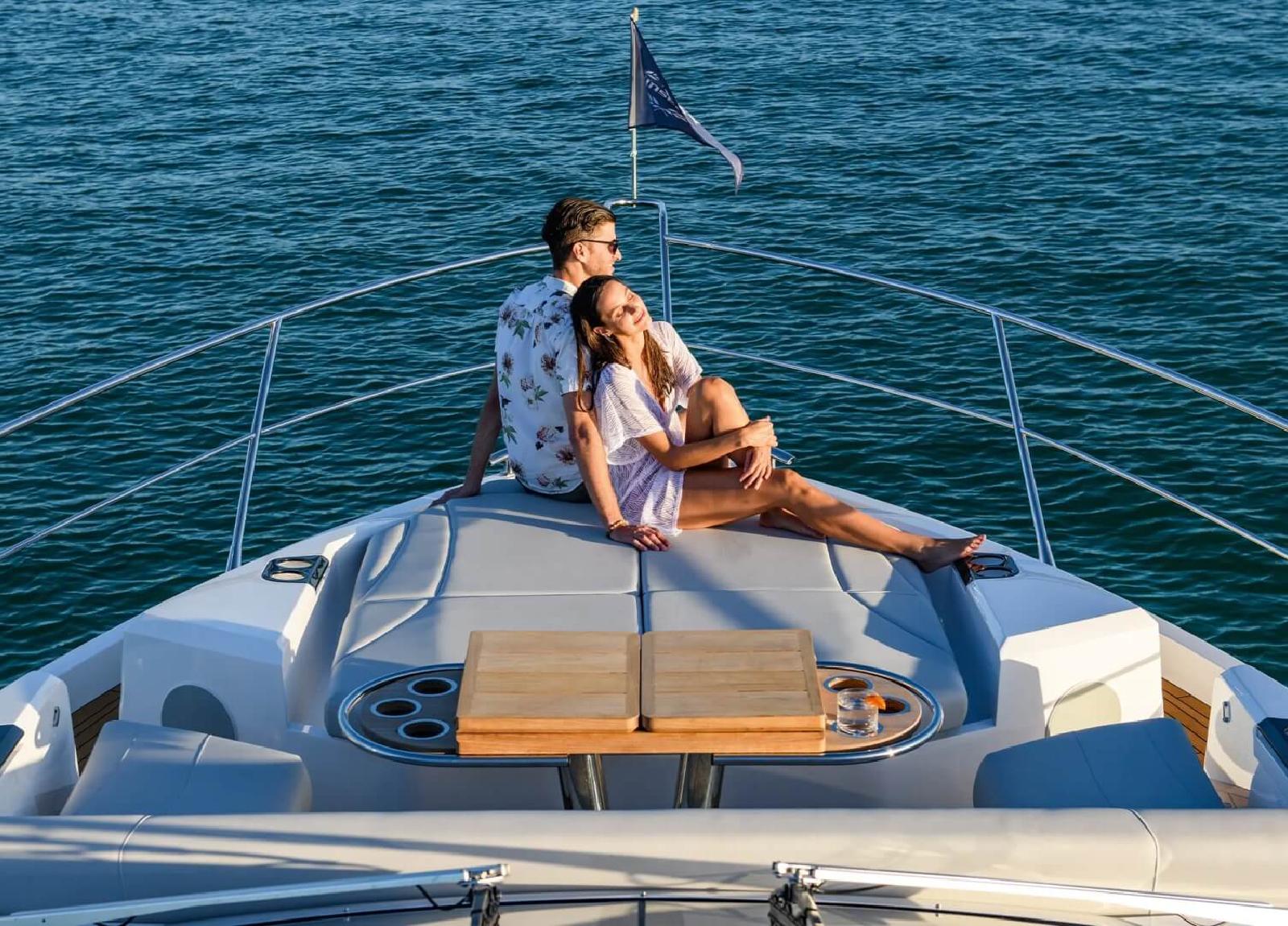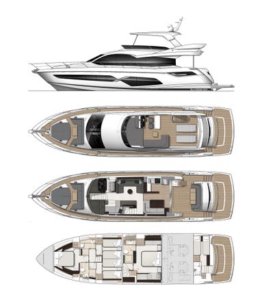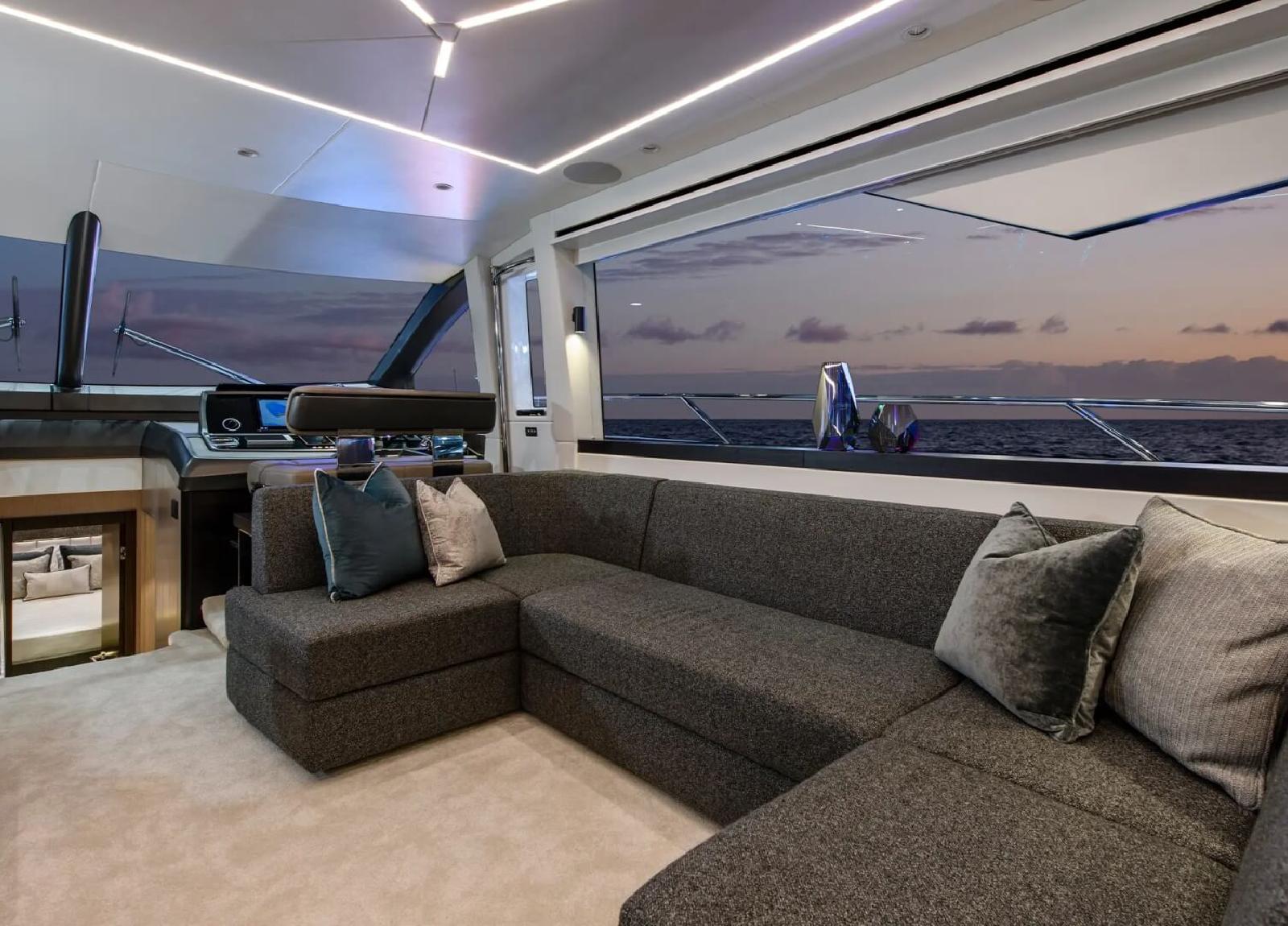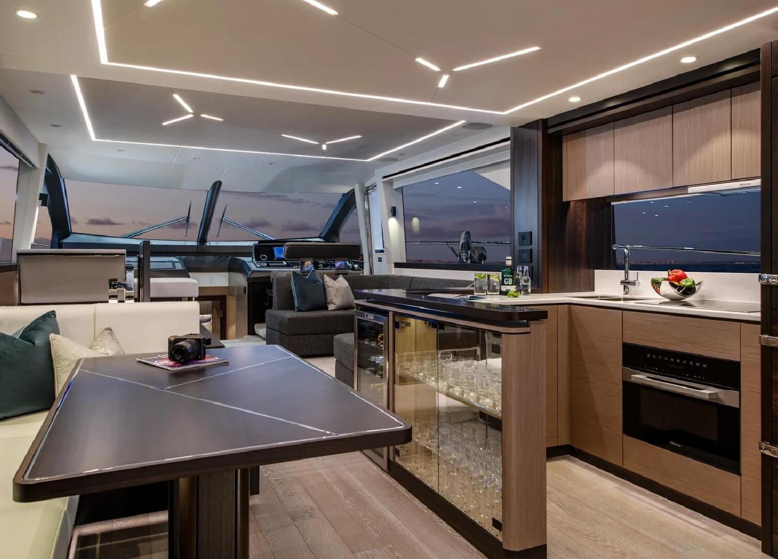 Vom einladenden Sitzbereich und Sonnenliegen auf dem Bug bis zum weitläufigen Cockpit, das an einen topmodernen Beach Club grenzt, ist jedes Detail berücksichtigt. Im Inneren verfügt der Hauptsalon über weitläufige Verglasungen, die faszinierende Blicke auf die umgebende Meereslandschaft bieten. Die voll ausgestattete Heckküche ist nahtlos mit dem Cockpit durch breite Schiebetüren verbunden und fördert das Miteinander. Mit einem Fokus auf stimmungsvolle Beleuchtung und Innendetails gewährleistet das innovative Layout mühelose Bewegung zwischen den Räumen.